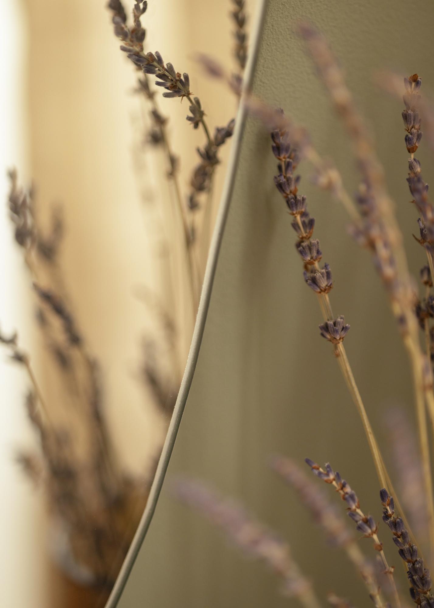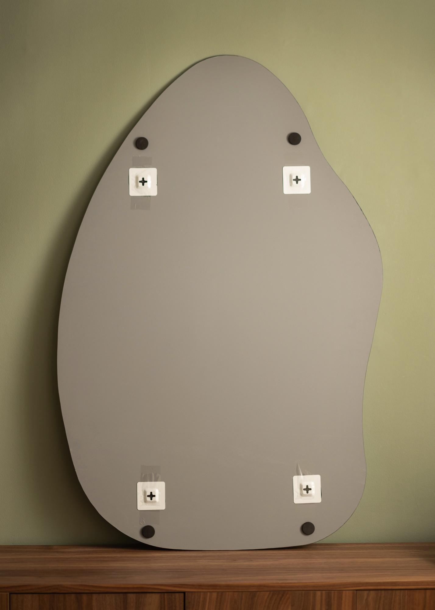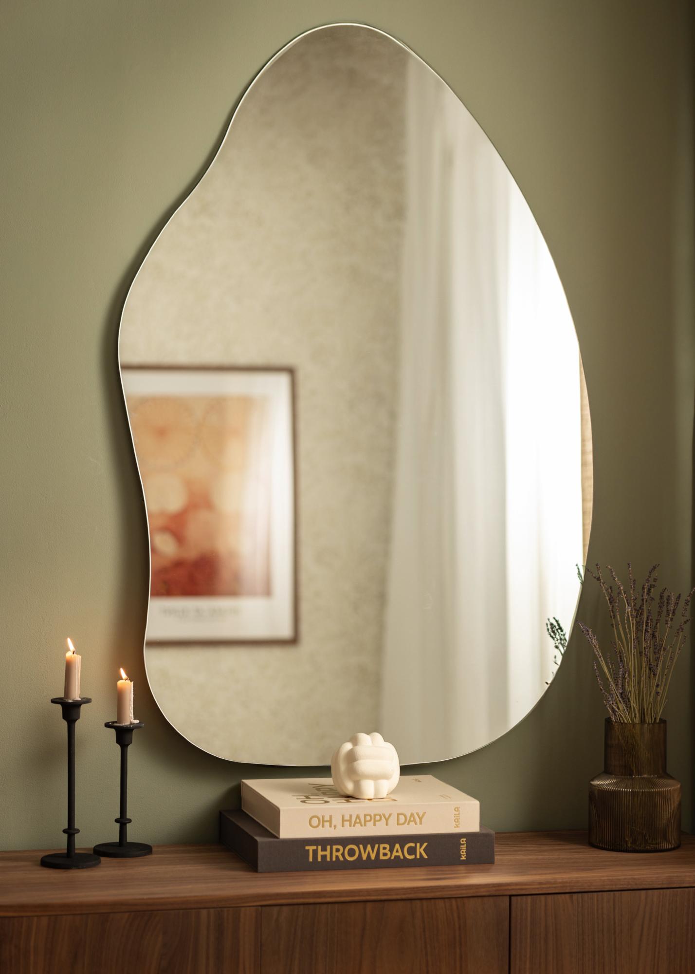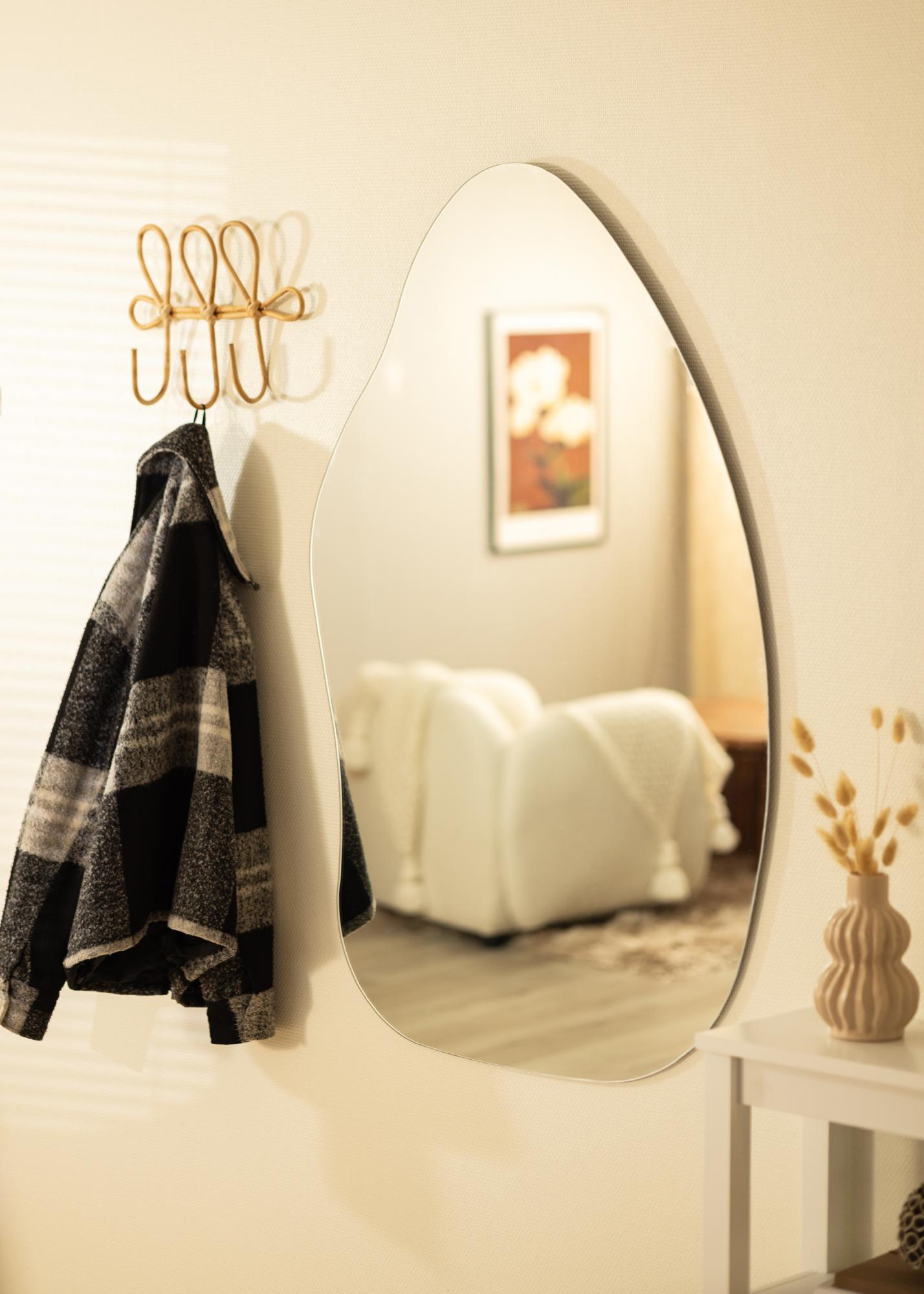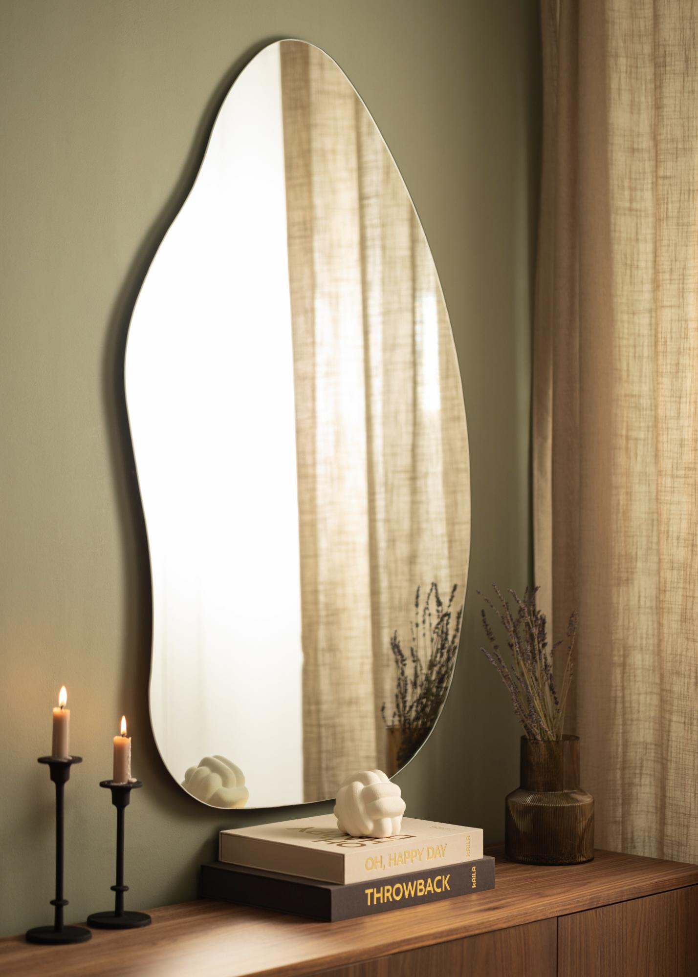 El espejo tiene una forma suave y orgánica que recuerda a una gota de agua o una hoja vertical, lo que le da una sensación elegante y moderna a la habitación. Esta forma única hace que el espejo sea una pieza de conversación y una obra de arte en sí misma, al mismo tiempo que cumple su función práctica.