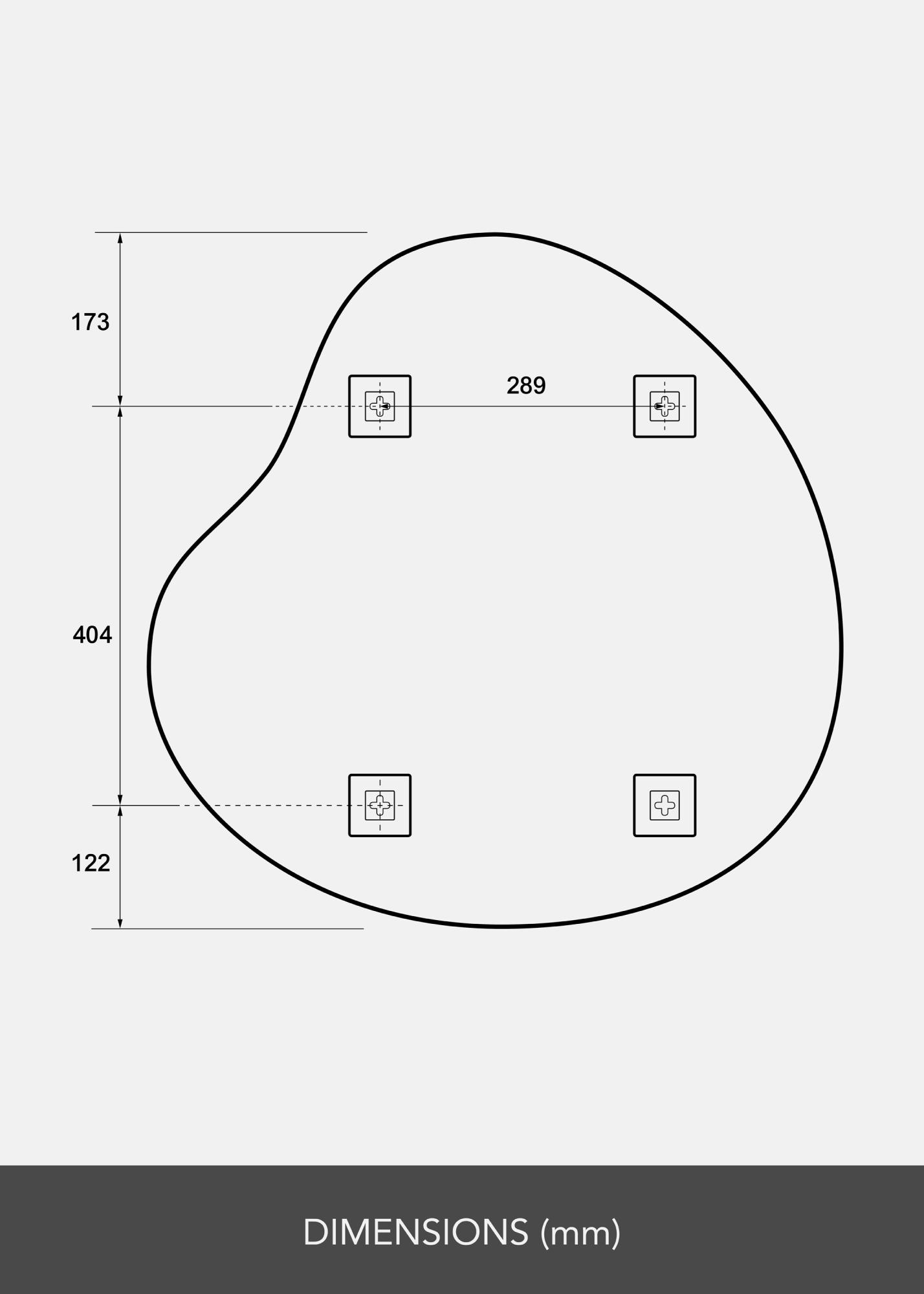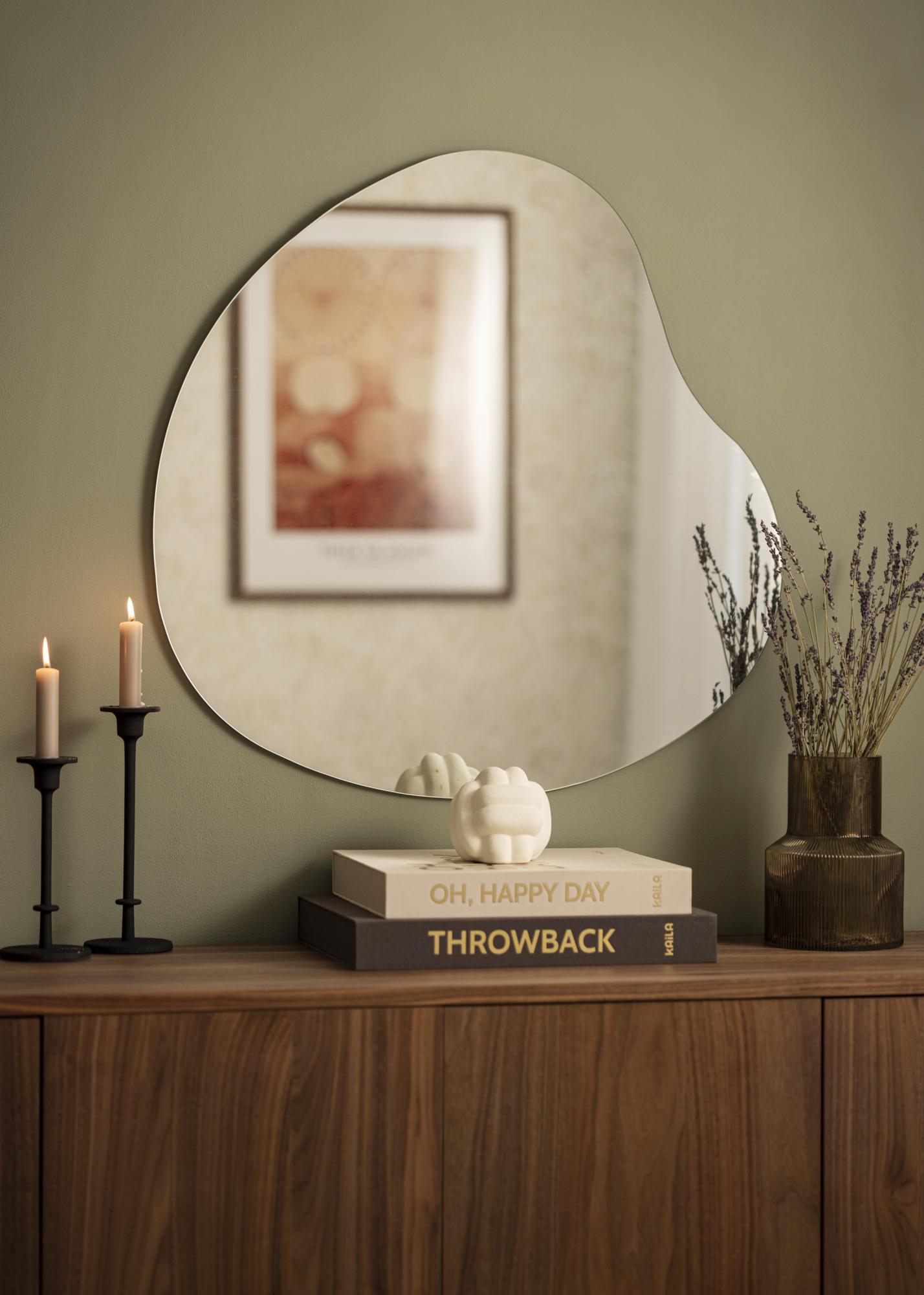 El espejo tiene una forma suavemente contorneada y asimétrica que se curva con gracia y da la impresión de movimiento y suavidad. Este diseño hace que el espejo sea un detalle artístico en la pared, al mismo tiempo que mantiene su función práctica.