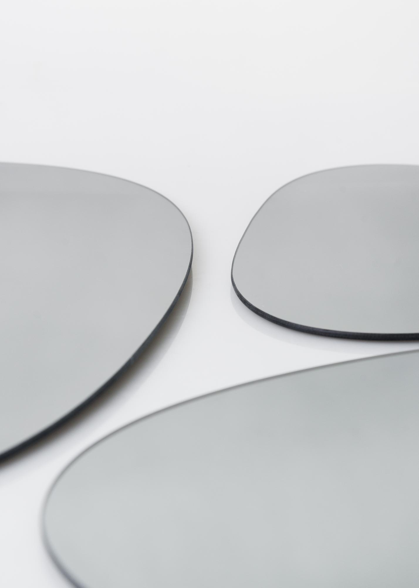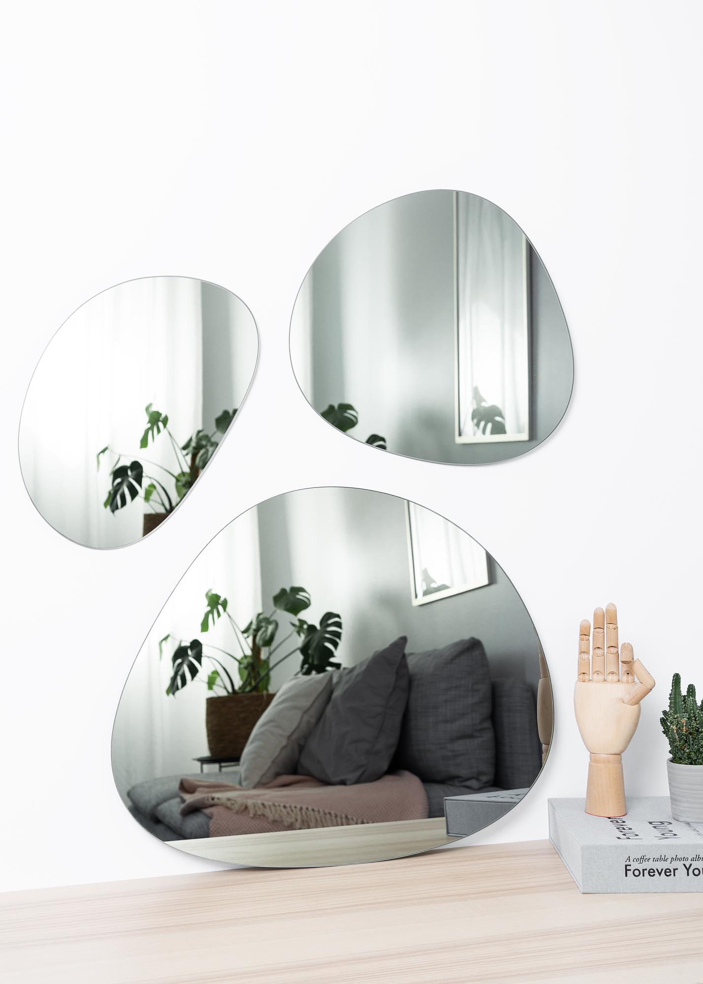Este conjunto de espejos es de la marca danesa Incado, lo que significa que tienen una alta calidad y un alto factor de tendencia. El hecho de que estén hechos de vidrio de espejo tonal en un color gris cálido los hace aún más elegantes, y su diseño con diferentes tamaños es divertido.