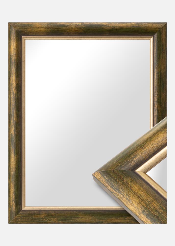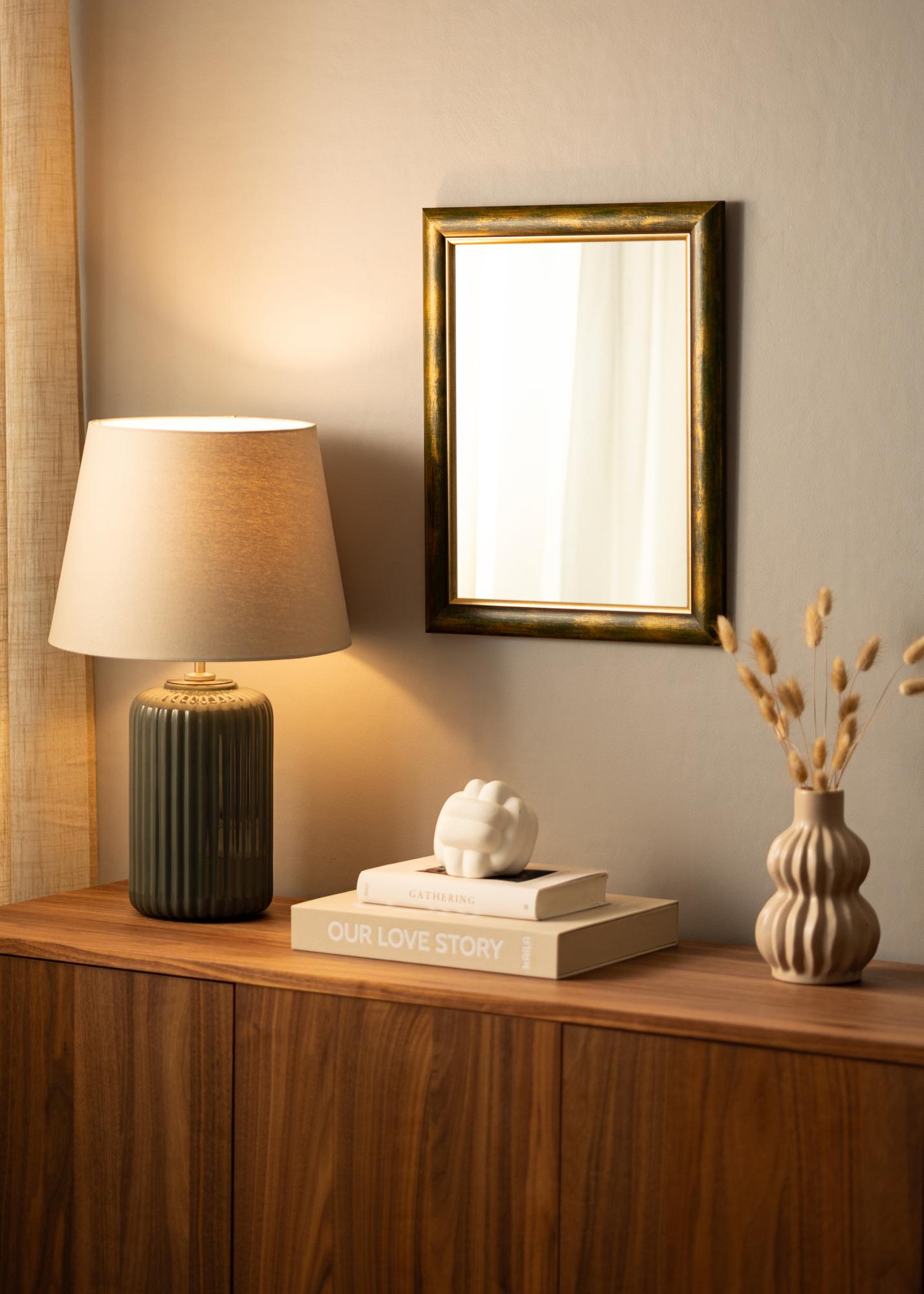 Lista de madera atemporal fabricada en Finlandia con una superficie de madera de tono verde elegante y un borde dorado junto al espejo. El marco tiene un perfil ancho de 41 mm y una profundidad de 19 mm, lo que le da una mayor profundidad a tu espejo.