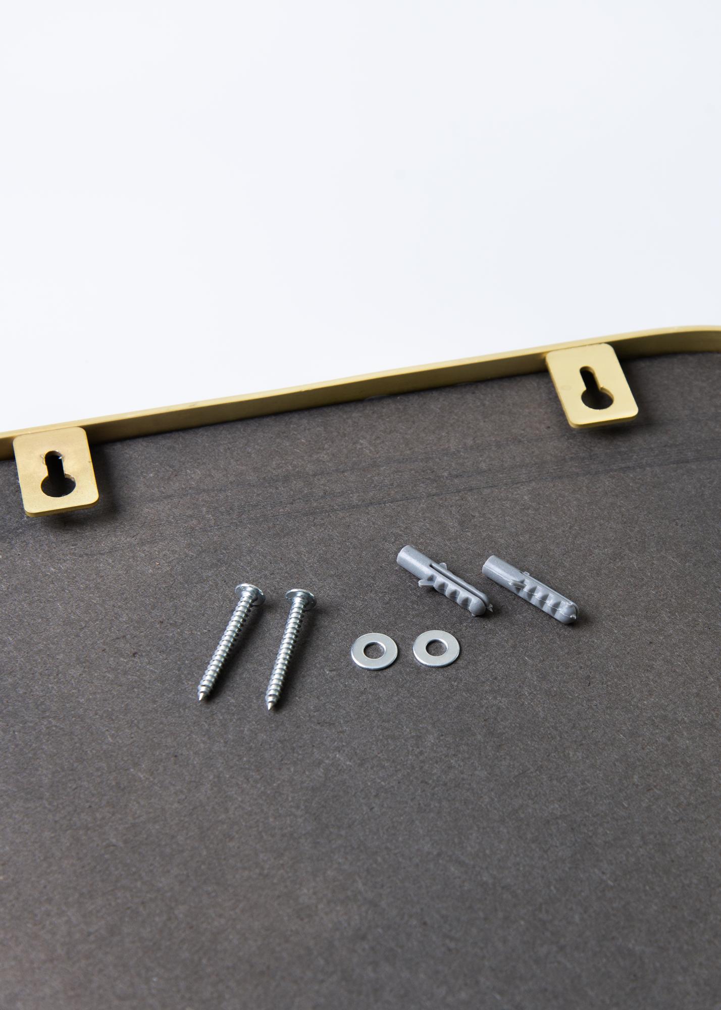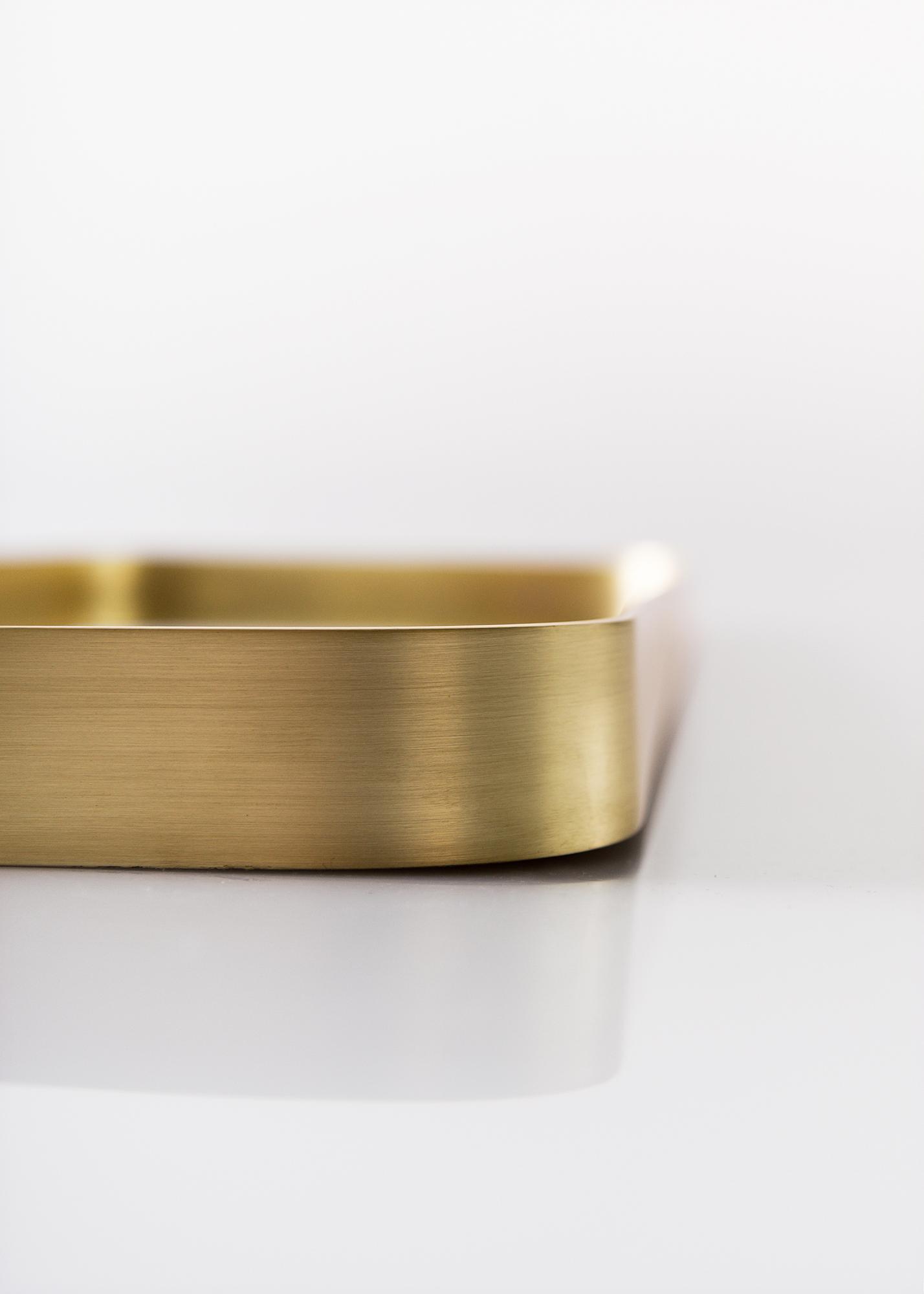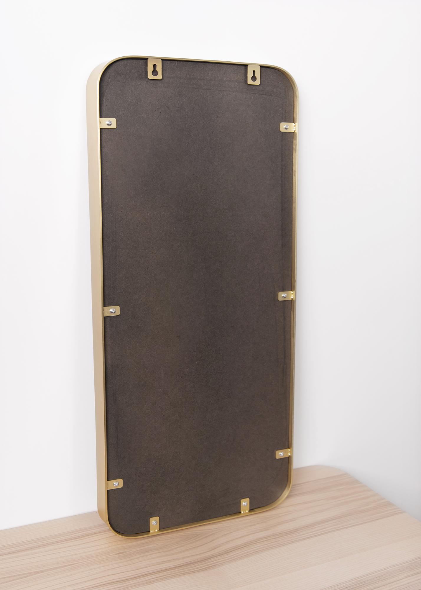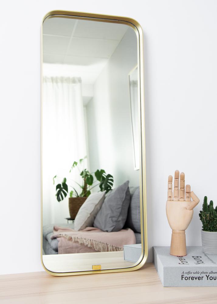 Un espejo rectangular de diseño danés elegante. El marco tiene esquinas redondeadas y está hecho de metal con acabado en latón, lo que le da una impresión suave y elegante. El espejo se puede colgar en la pared o sencillamente apoyarse contra la pared en un escritorio o estante. Este elegante espejo es de la marca danesa Hübsch.