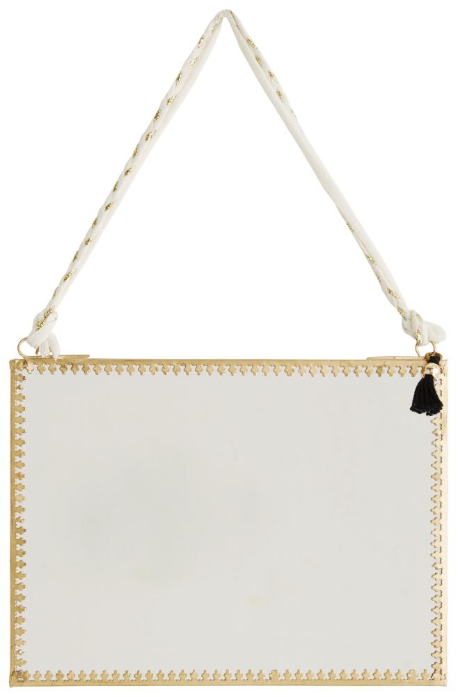 Hermoso espejo de Madam Stoltz, que se convierte en un elegante detalle en todas las habitaciones del hogar. El espejo tiene un marco dorado con forma elegante y un borla decorativa en una esquina. La correa de suspensión está hecha de algodón, lo que le da al espejo una sensación bohemia. El espejo de pared tiene un tamaño de 20x15 cm y su tamaño compacto lo hace muy elegante para combinar con otros modelos de espejos. Está hecho a mano, lo que hace que cada artículo individual pueda variar ligeramente en apariencia.