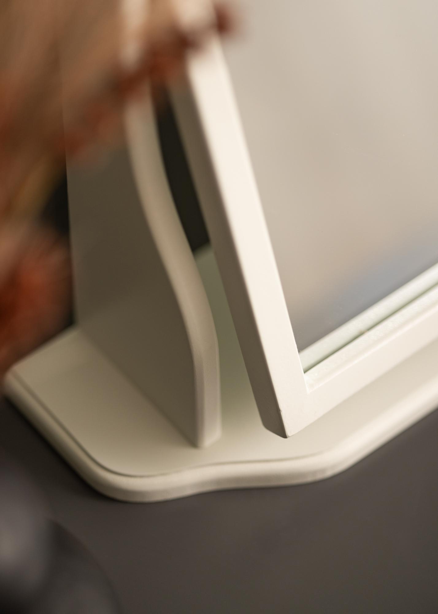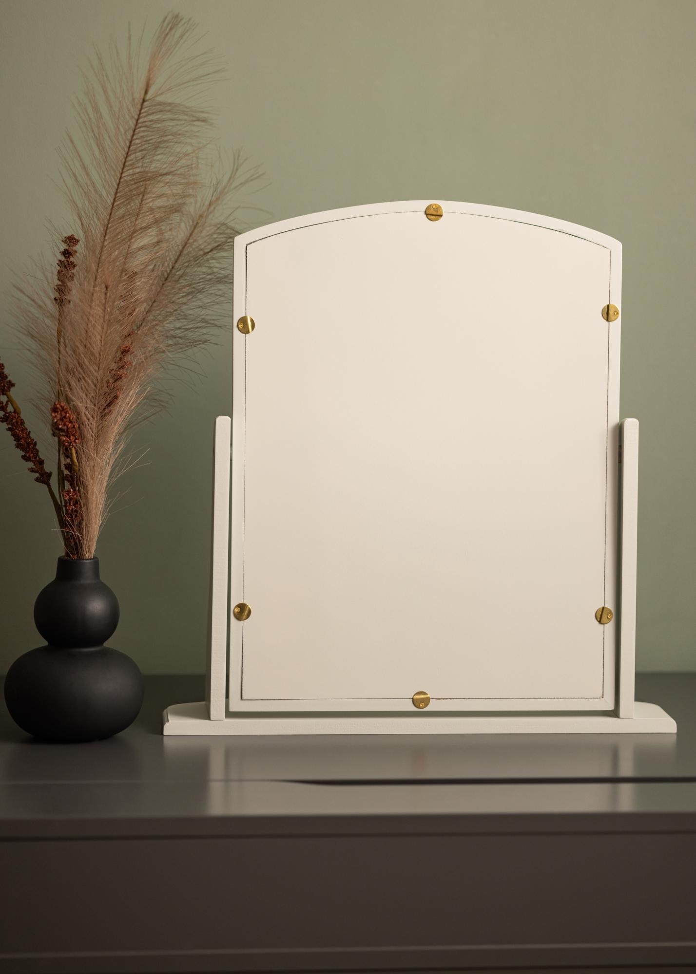 Este espejo está diseñado con un marco gris que le da un toque sutil y sofisticado a la habitación. Se mantiene estable sobre una base robusta, lo que lo hace ideal para su uso en una mesa o cómoda donde te preparas para el día o la noche.