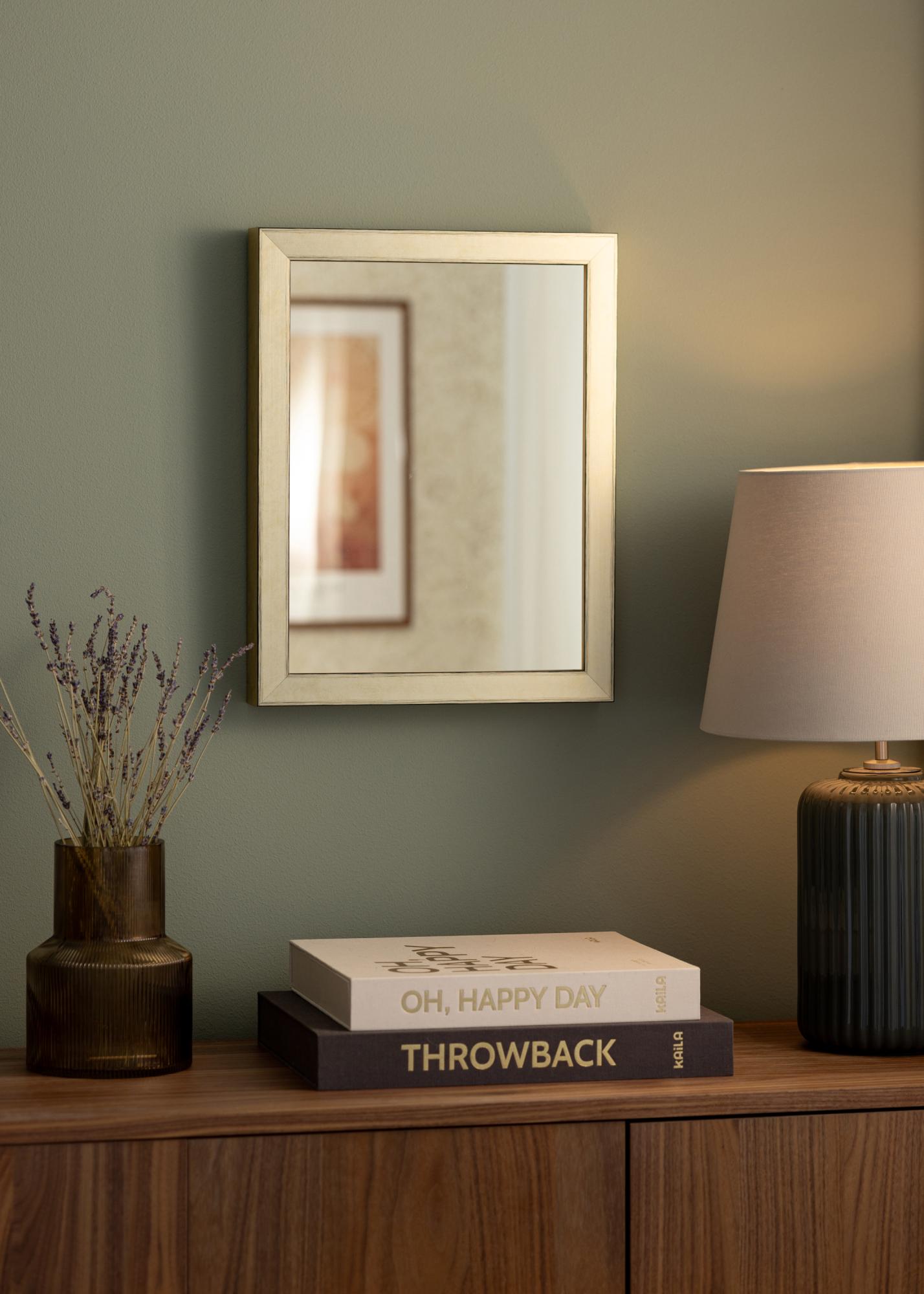 El marco del Espejo Tyr Oro tiene 30 mm de ancho y una profundidad de 50 mm, lo que le da al espejo una sensación robusta y sólida. Fabricado de pino, combina durabilidad con estética. La sutil pátina del marco le da al espejo un carácter único sin dominar la habitación, lo que lo convierte en una excelente elección para cualquier tipo de decoración.