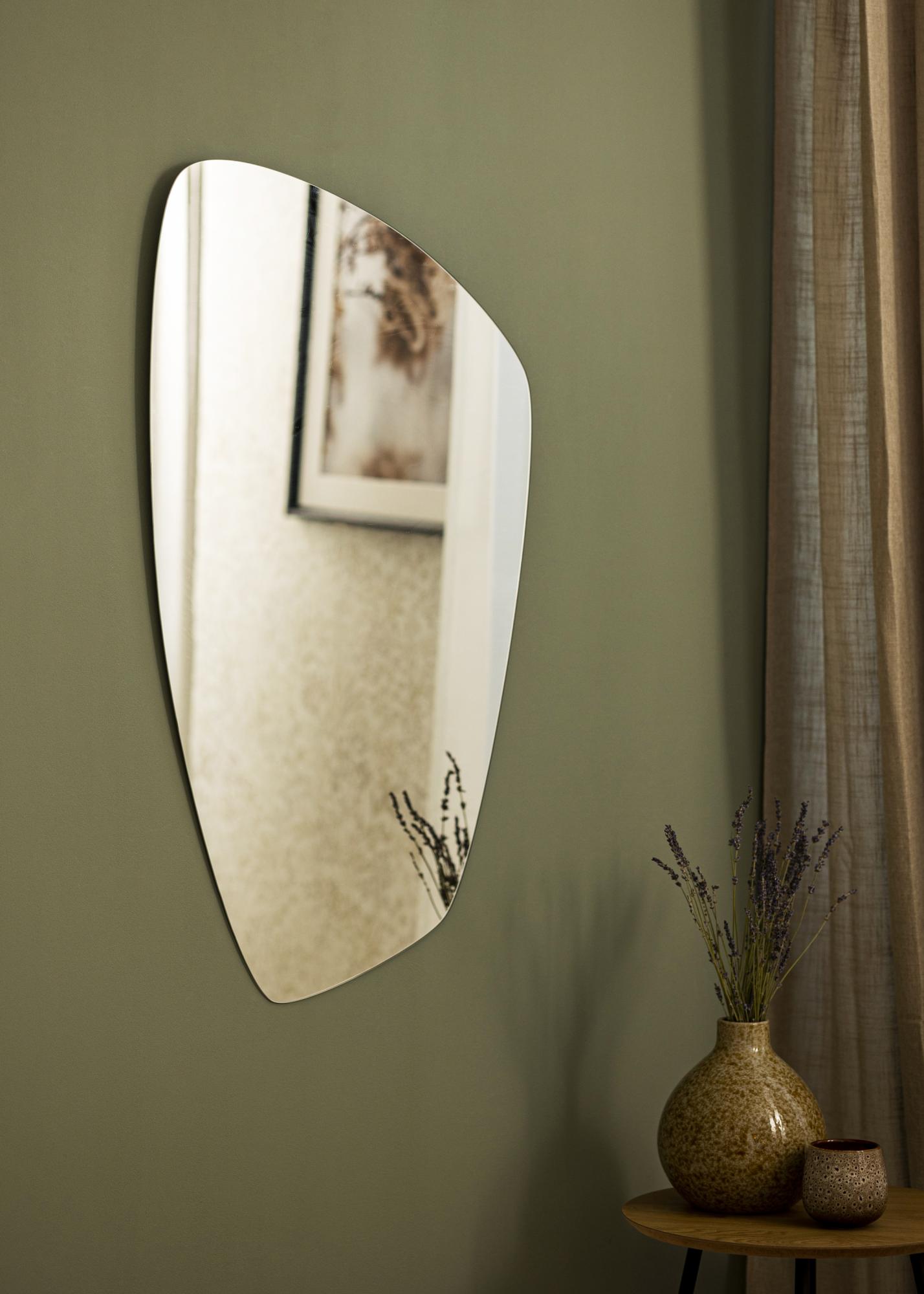 El espejo tiene una forma asimétrica y curvada que le brinda una expresión moderna y elegante, perfecto para un estilo de decoración contemporáneo. Su diseño único contribuye a una sensación de amplitud y luz en la habitación, al mismo tiempo que funciona como un detalle práctico y decorativo.