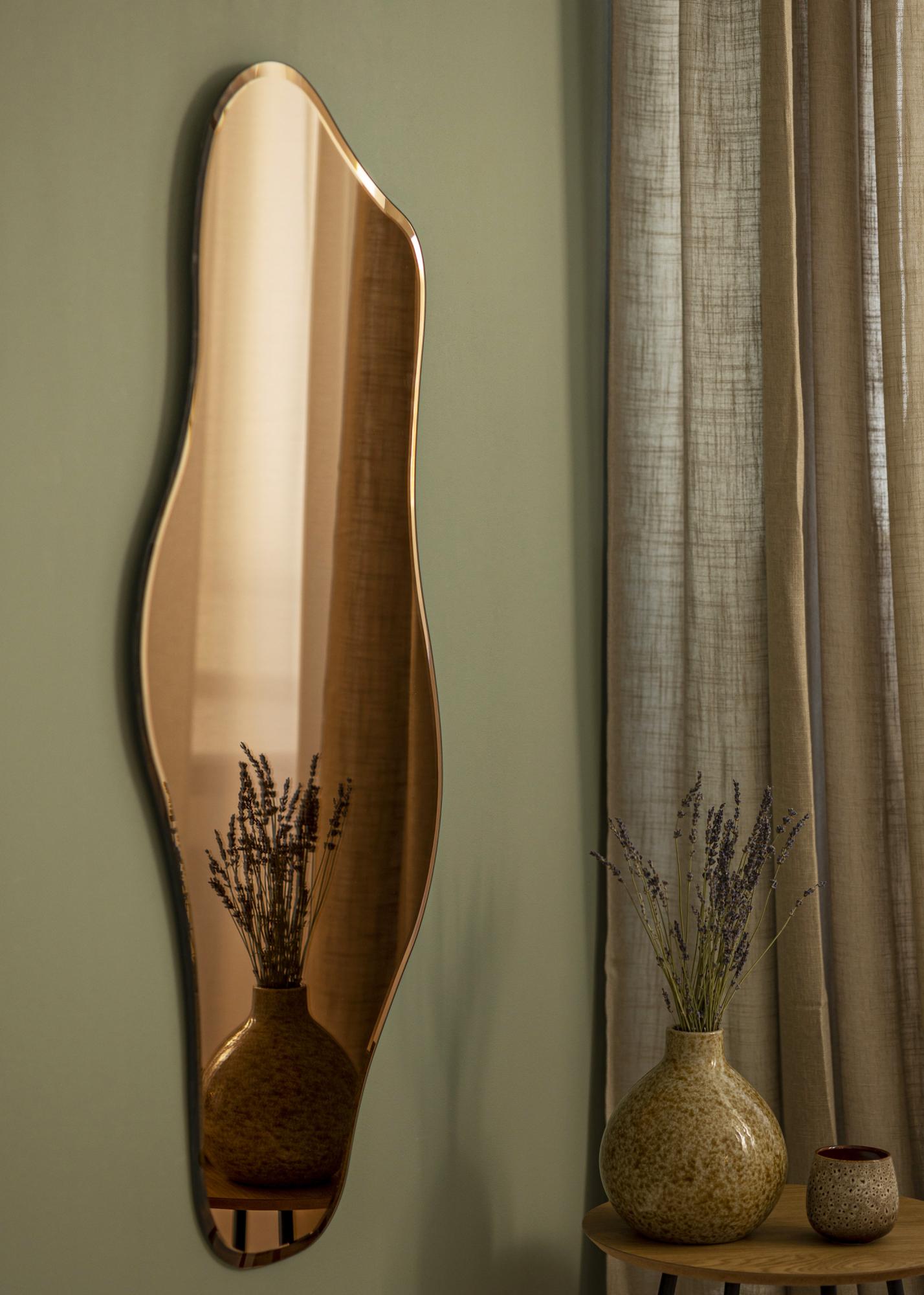Este espejo no solo es un elemento práctico, sino también un detalle decorativo. Está adornado con un borde facetado que le da profundidad y dimensión adicionales a la imagen. El vidrio del espejo en tono rosa crea un toque cálido y de moda, convirtiendo al espejo en un detalle llamativo en la habitación.