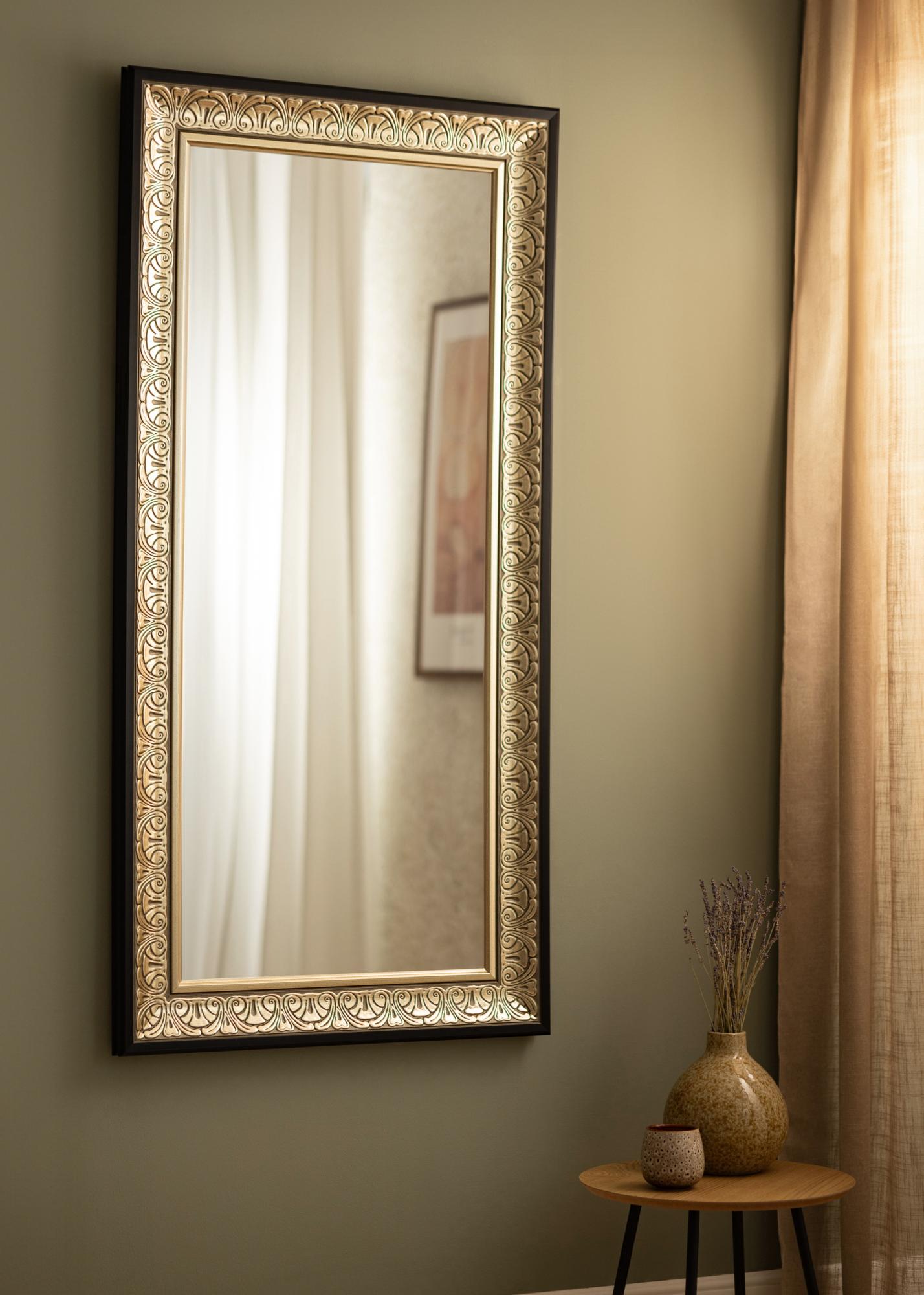 Elegante espejo plateado ornamentado que se adapta tanto a un vestidor como al recibidor o al baño. El aspecto del marco alrededor del espejo, con su diseño atemporal, hace que el espejo se adapte a todo tipo de estilos de decoración, desde dormitorios románticos y femeninos en tonos pastel hasta entornos más minimalistas y despojados donde el espejo crea un contraste. También es ideal para colgarlo encima de un aparador o buffet para dar una sensación de mayor amplitud en la habitación.