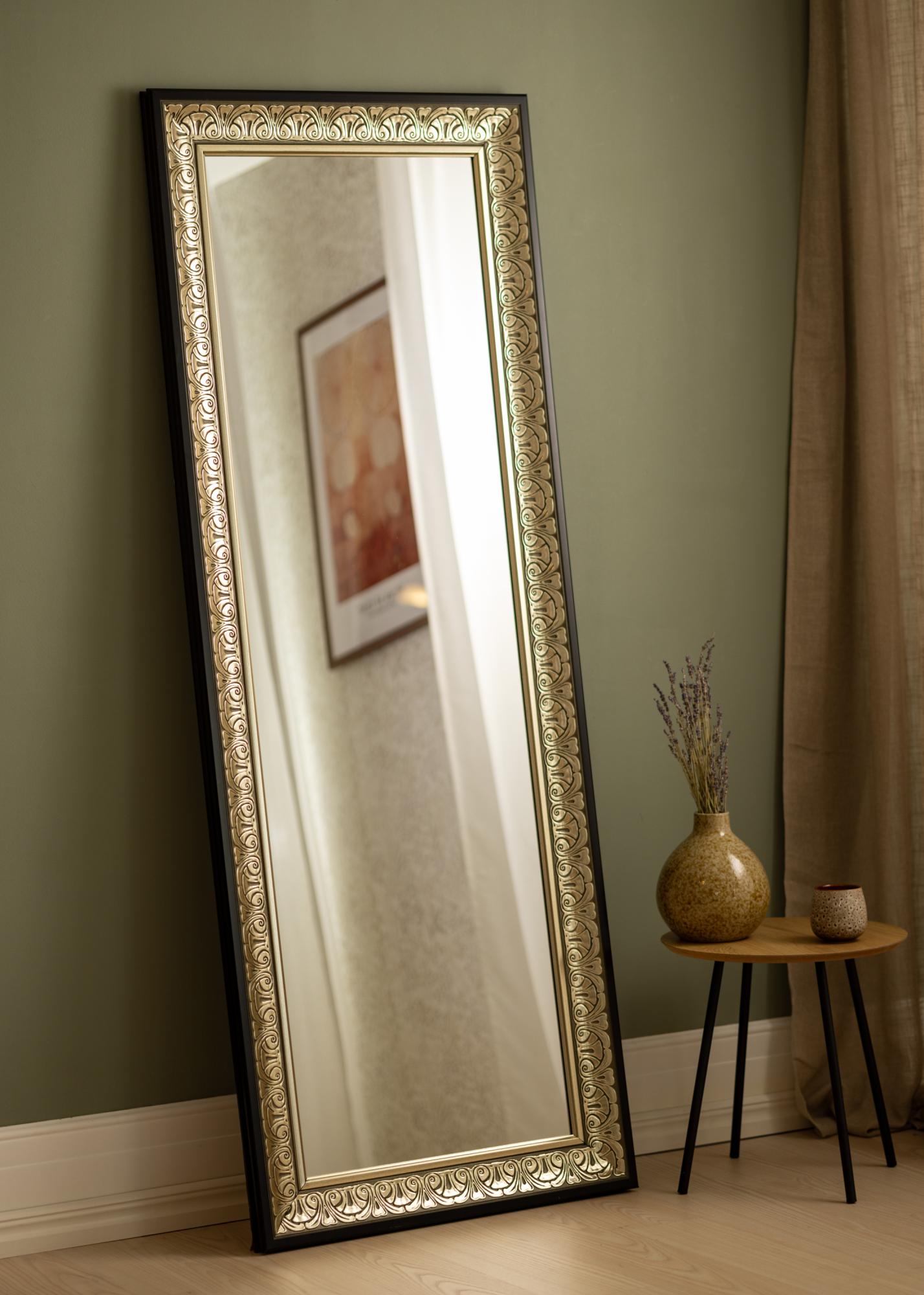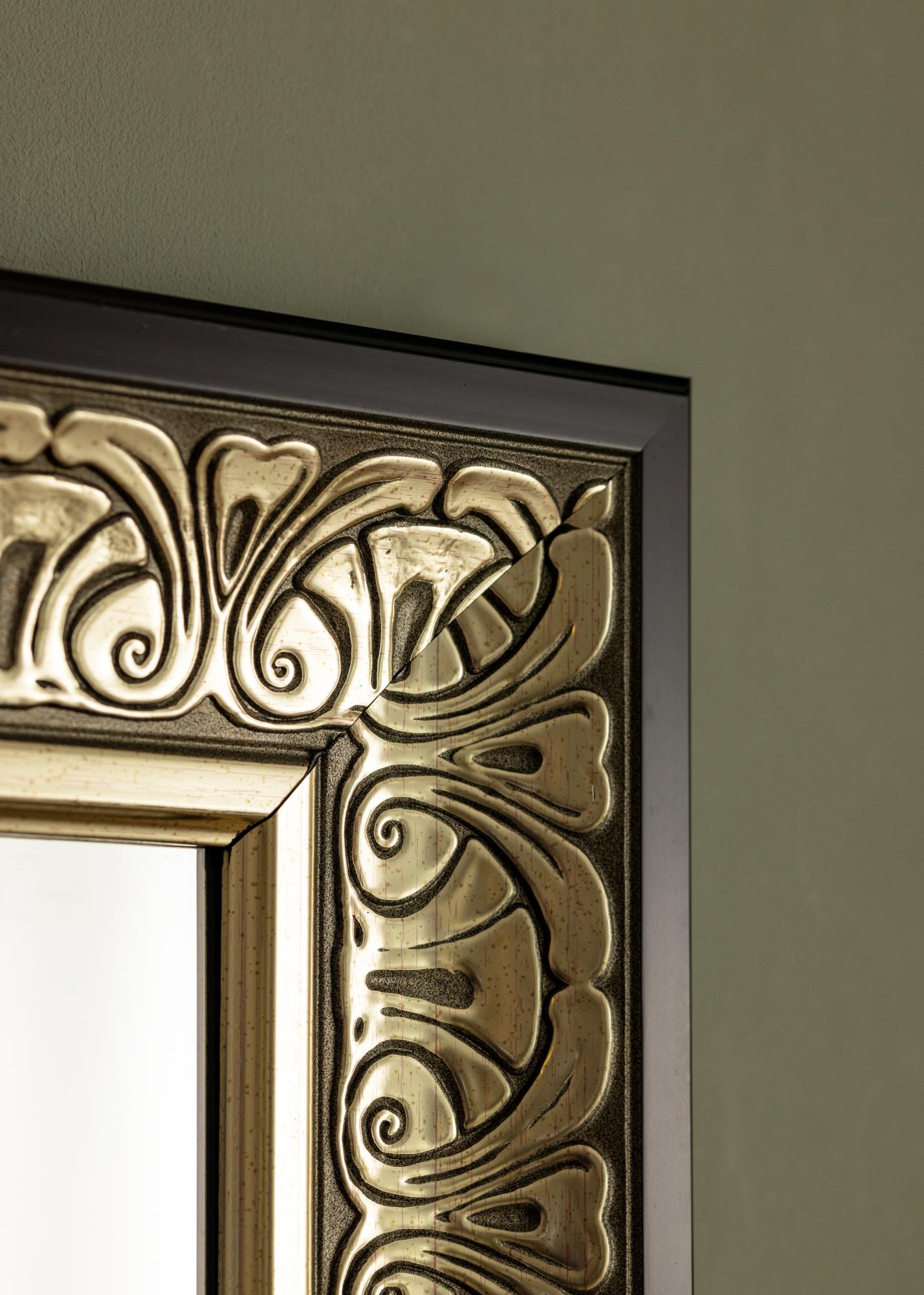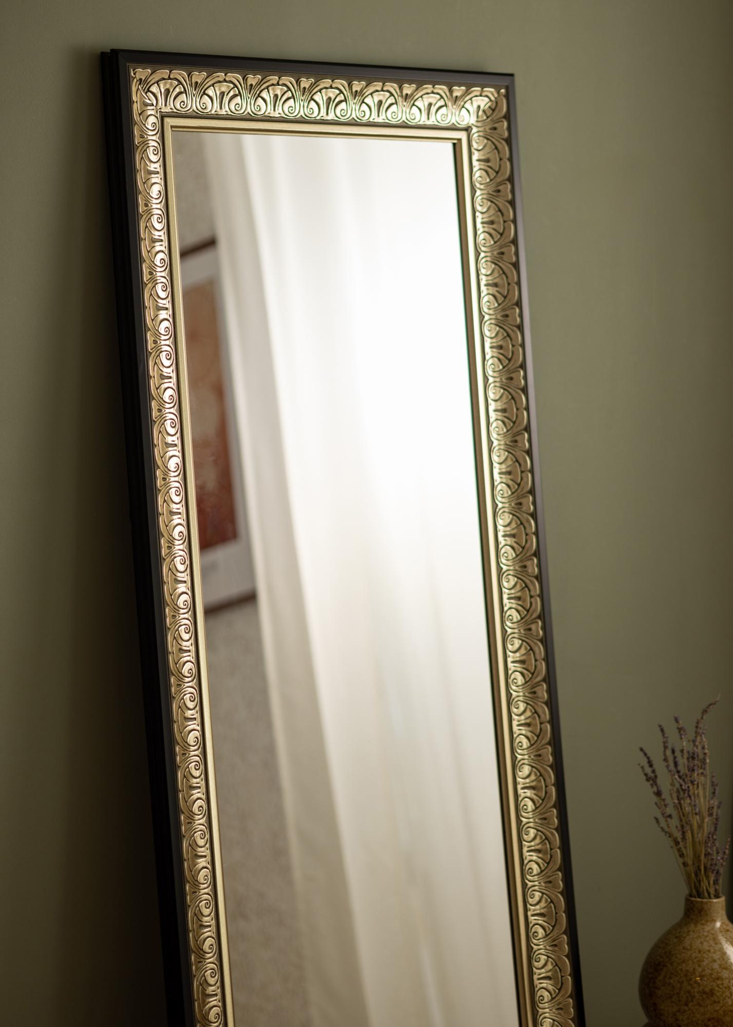 Elegante espejo plateado ornamentado que se adapta tanto a un vestidor como al recibidor o al baño. El aspecto del marco alrededor del espejo, con su diseño atemporal, hace que el espejo se adapte a todo tipo de estilos de decoración, desde dormitorios románticos y femeninos en tonos pastel hasta entornos más minimalistas y despojados donde el espejo crea un contraste. También es ideal para colgarlo encima de un aparador o buffet para dar una sensación de mayor amplitud en la habitación.