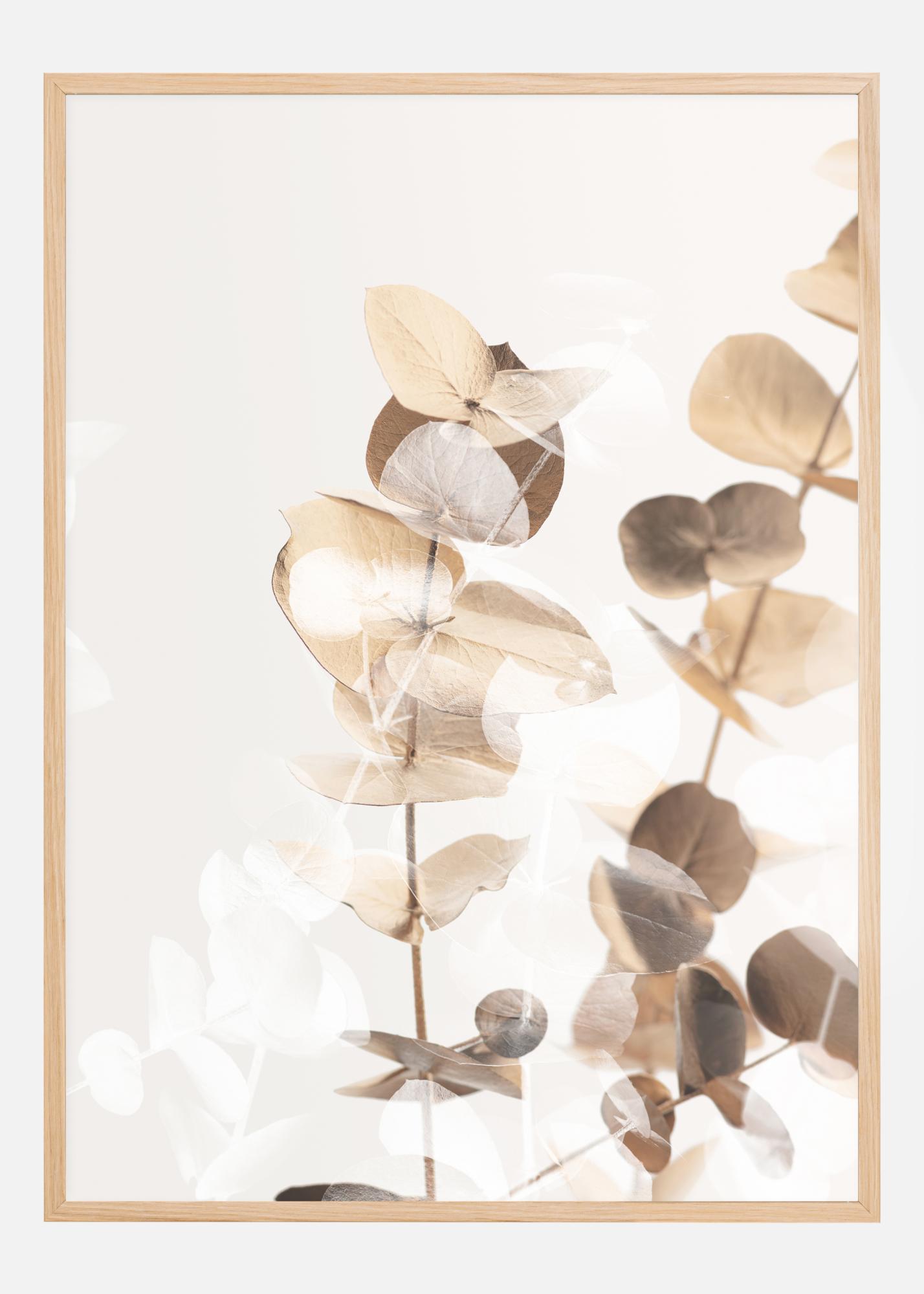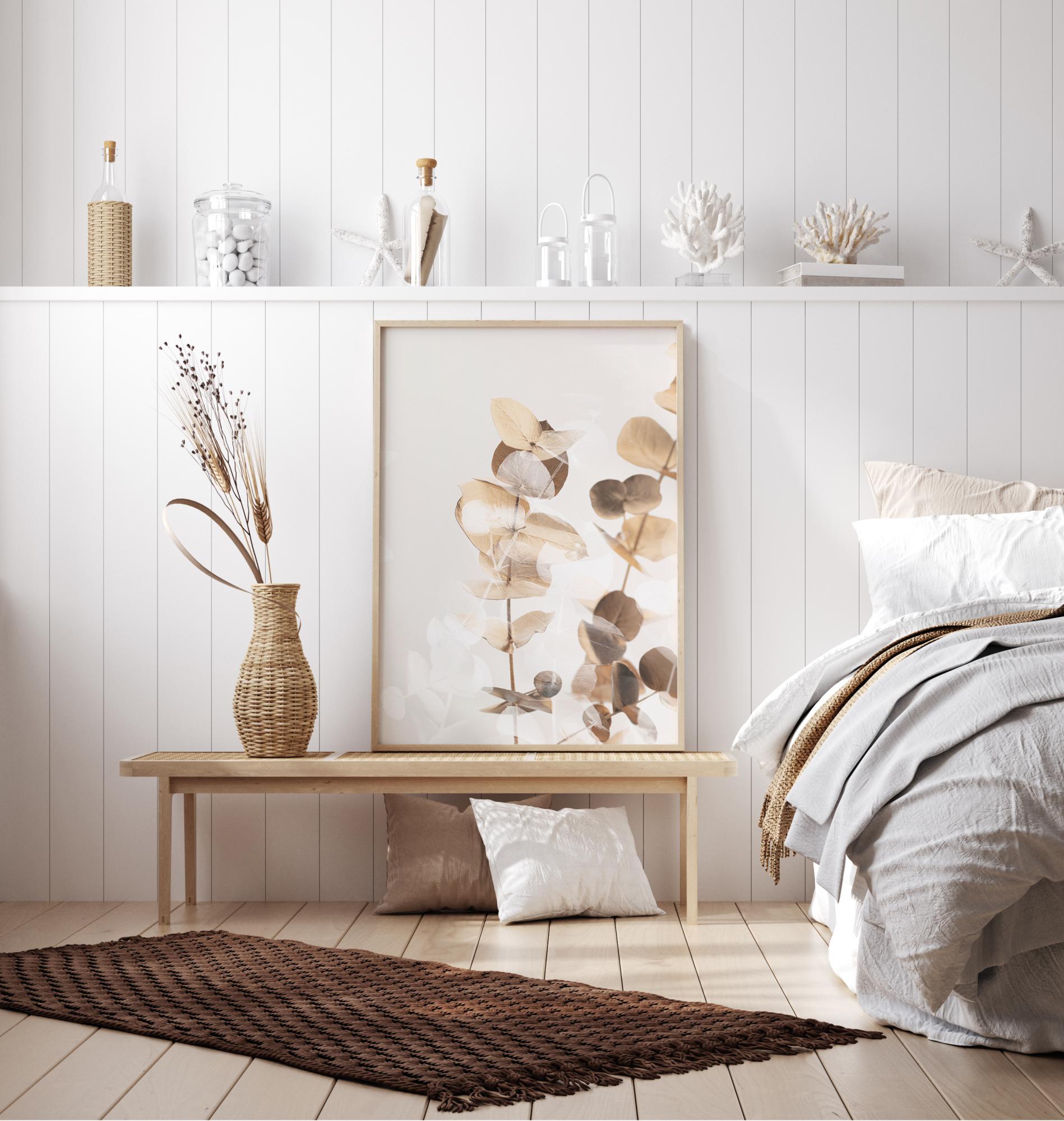 Un póster dorado con hojas y ramas de eucalipto. Las hojas doradas y marrones destacan en una forma brillante contra el fondo blanco sencillo. Para realzar estas hojas, combínalas con una pared de color dorado o crema oscuro similar para obtener una elegancia adicional.
