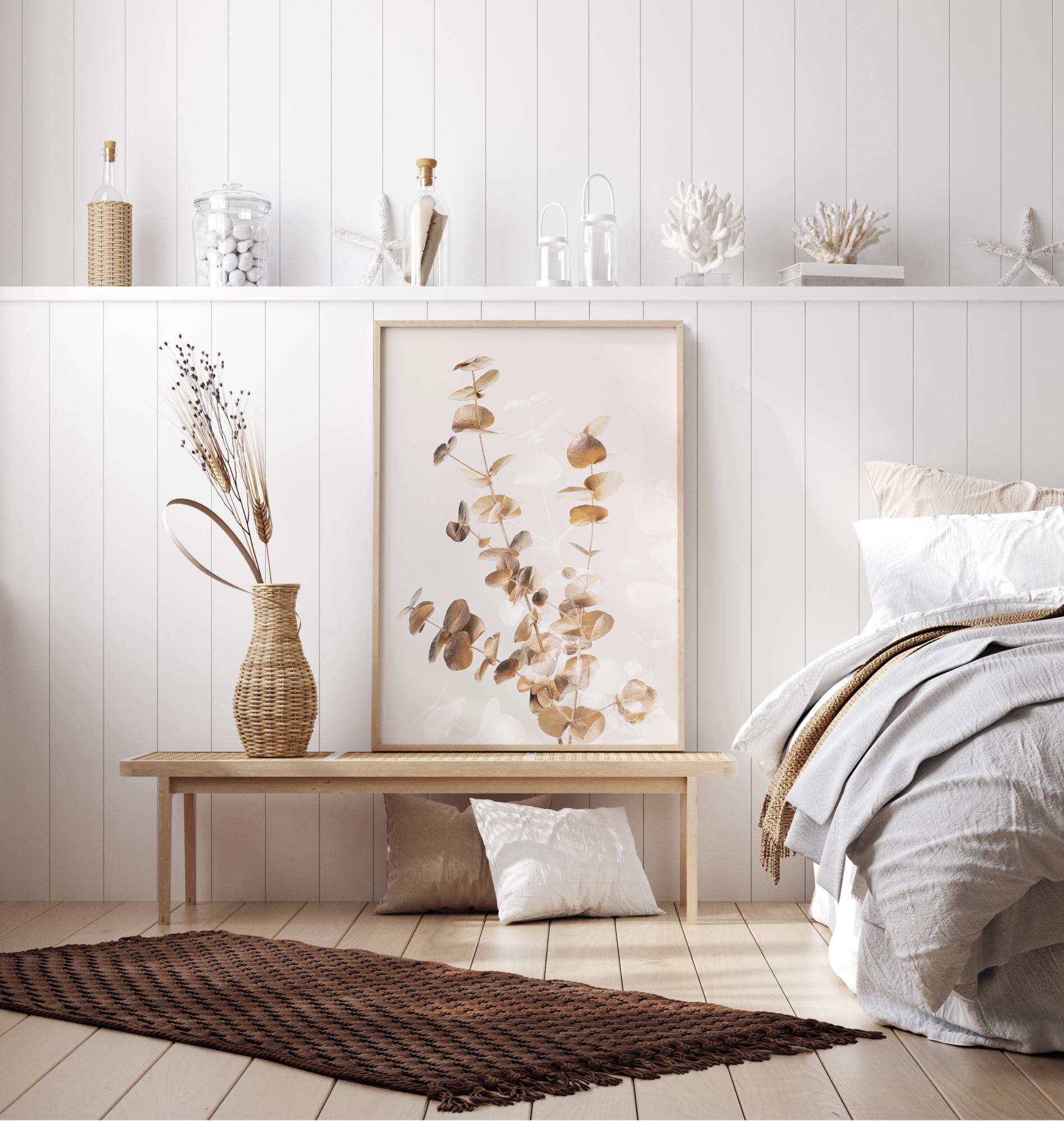 Un hermoso póster con ramas de eucalipto doradas. Las hojas doradas y marrones son suaves mientras sobresalen del fondo blanco. Las hojas son redondas, lo que crea formas hermosas en la imagen. Este póster brinda una sensación tranquila y elegante a tu hogar.