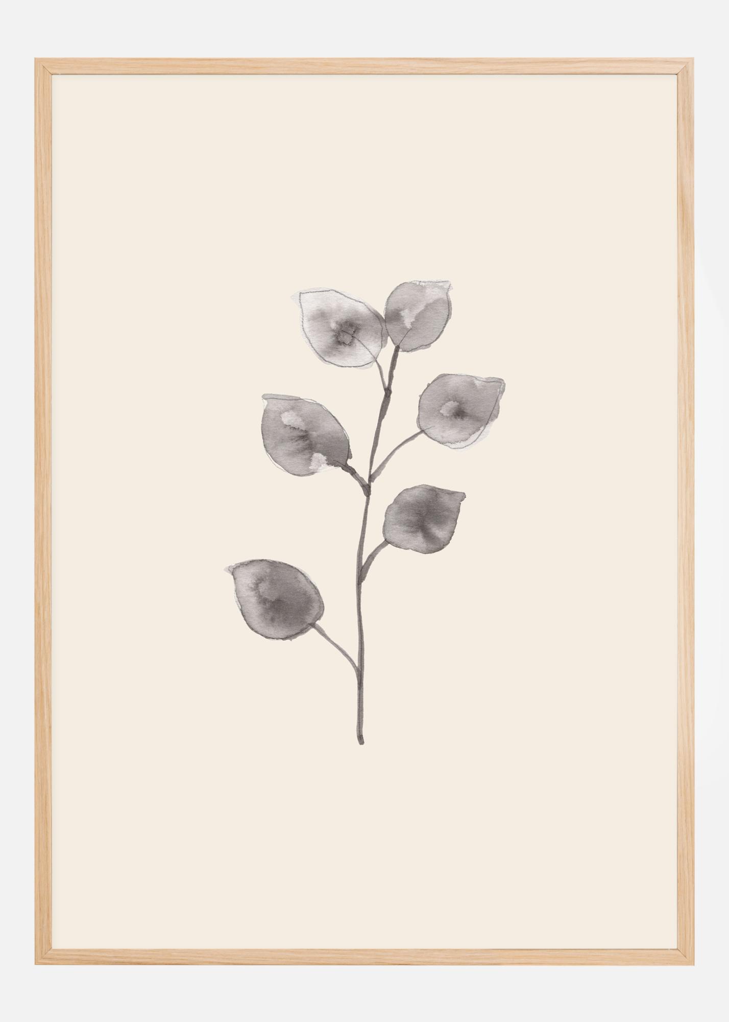 Un elegante póster con una sencillo pintura de una rama de eucalipto. Las hojas están hechas en estilo acuarela, por lo que son suaves y los bordes están casi difuminados. En un tono gris sencillo, las hojas se destacan sobre el fondo blanco. Cuelga esto en una pared verde para aportar color.