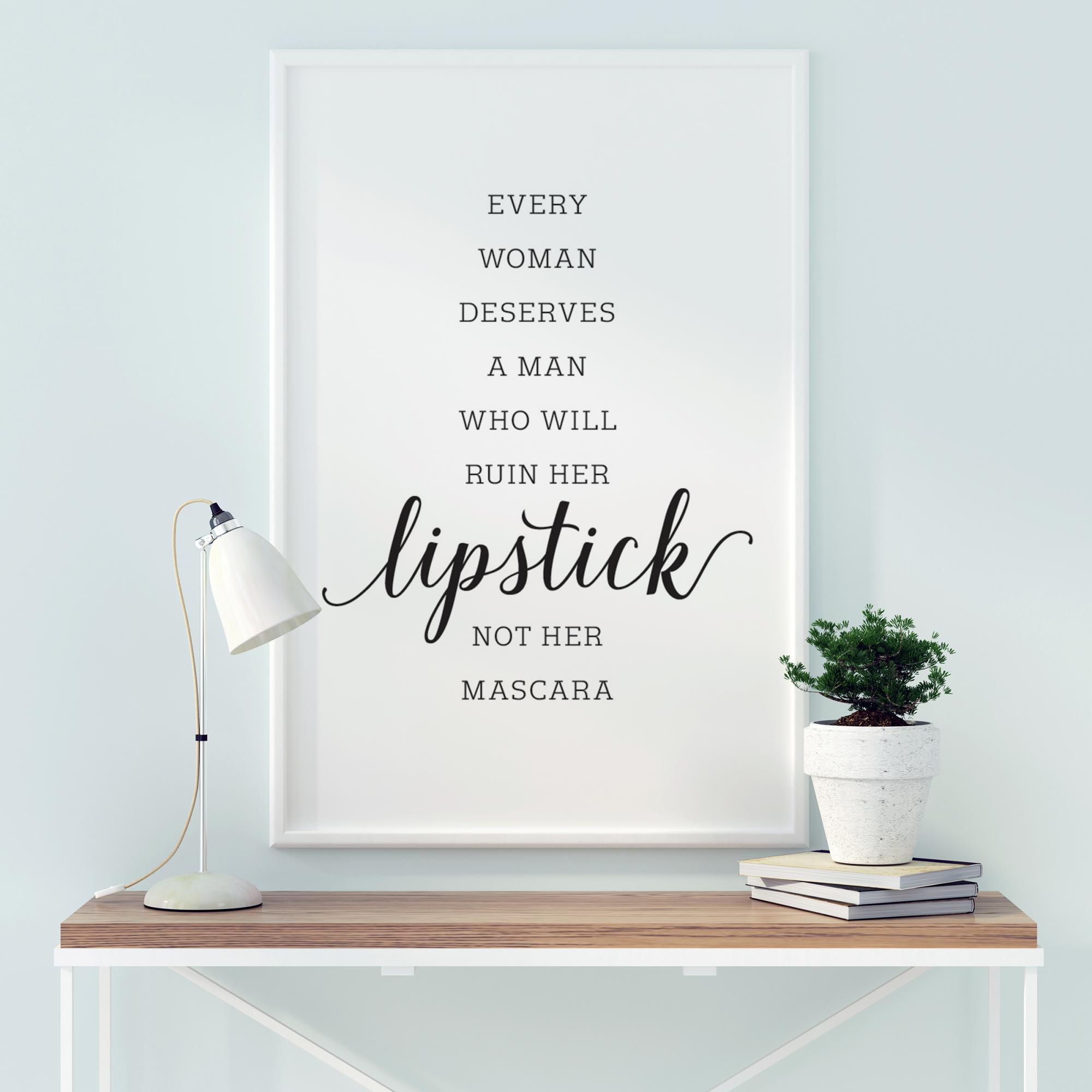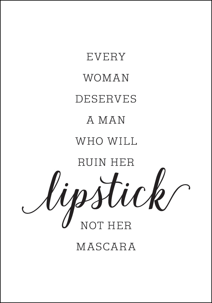 Un póster motivador con una cita poderosa para animarte a empezar por la mañana. "Every woman deserves a man who will ruin her lipstick, not her mascara" (Cada mujer merece un hombre que arruine sus labios pintados, no su máscara de pestañas). Comienza tu día con este sencillo pensamiento en esta linda imagen caligráfica e inspiradora.