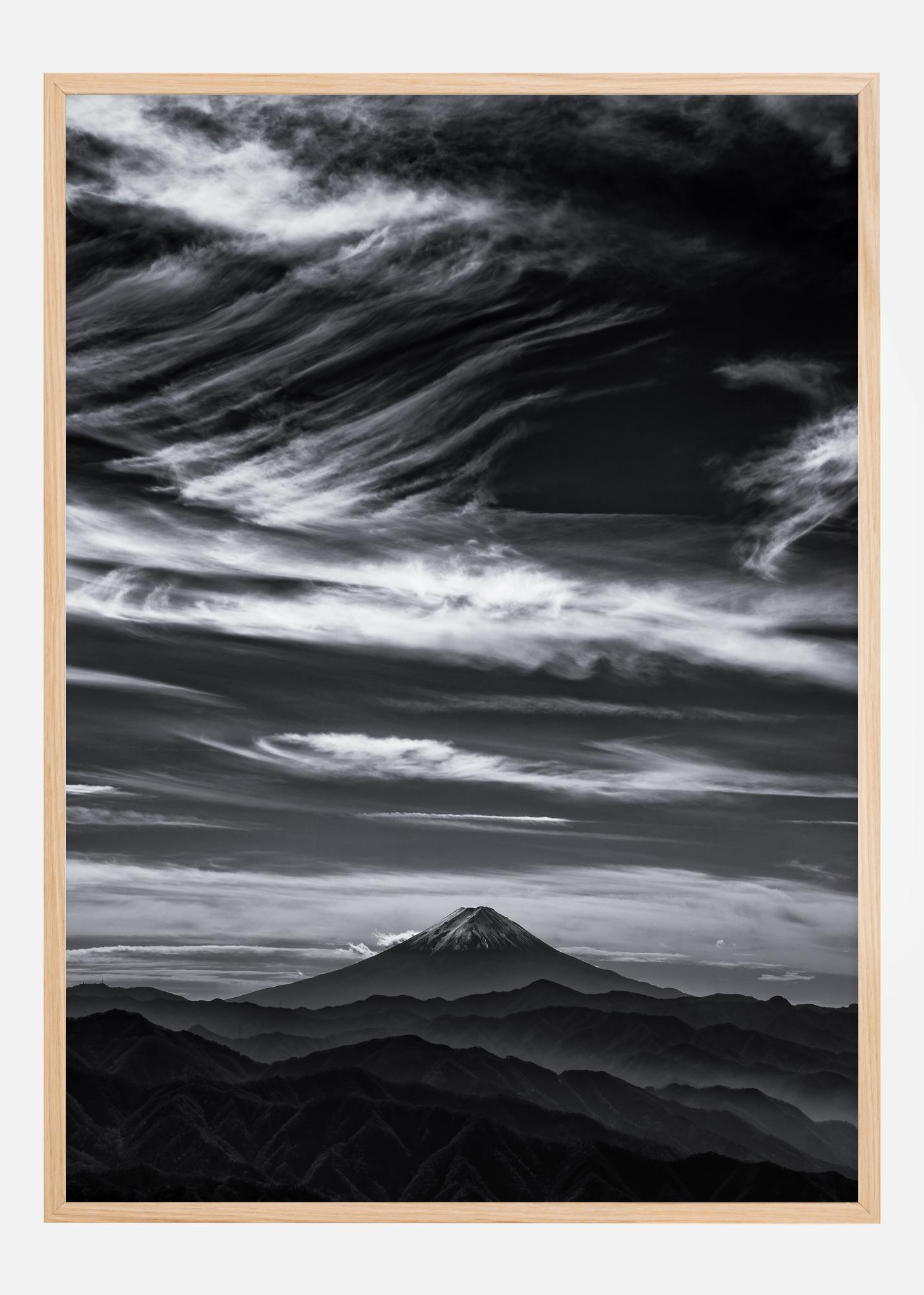 Este póster es una representación grandiosa en blanco y negro de la icónica montaña Fuji, rodeada por un dramático juego de nubes y vientos en el cielo arriba. El contraste entre las oscuras y acanaladas cadenas montañosas y el suave cielo proporciona una impresión visual poderosa y dinámica, que es tanto intemporal como encantadora.