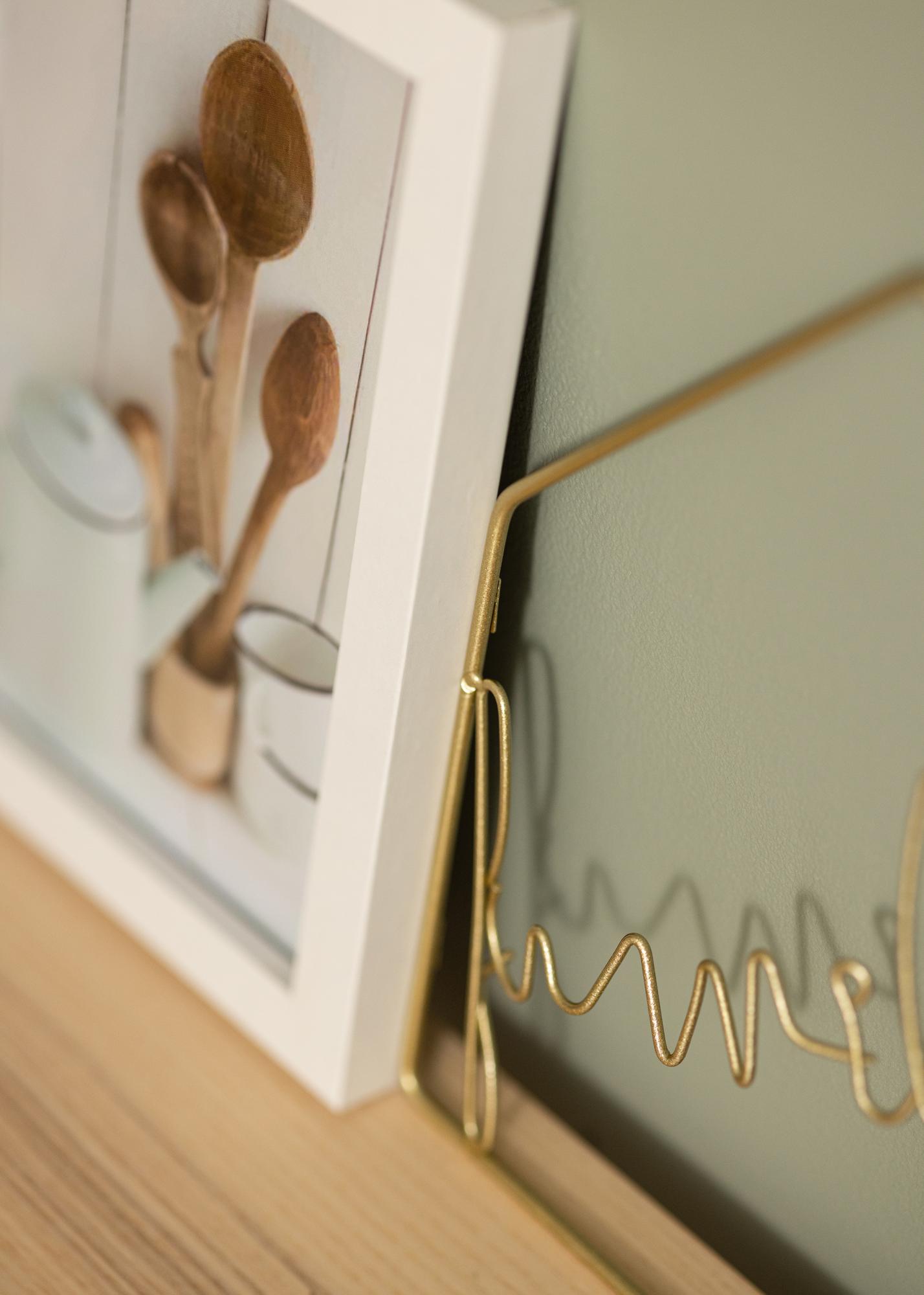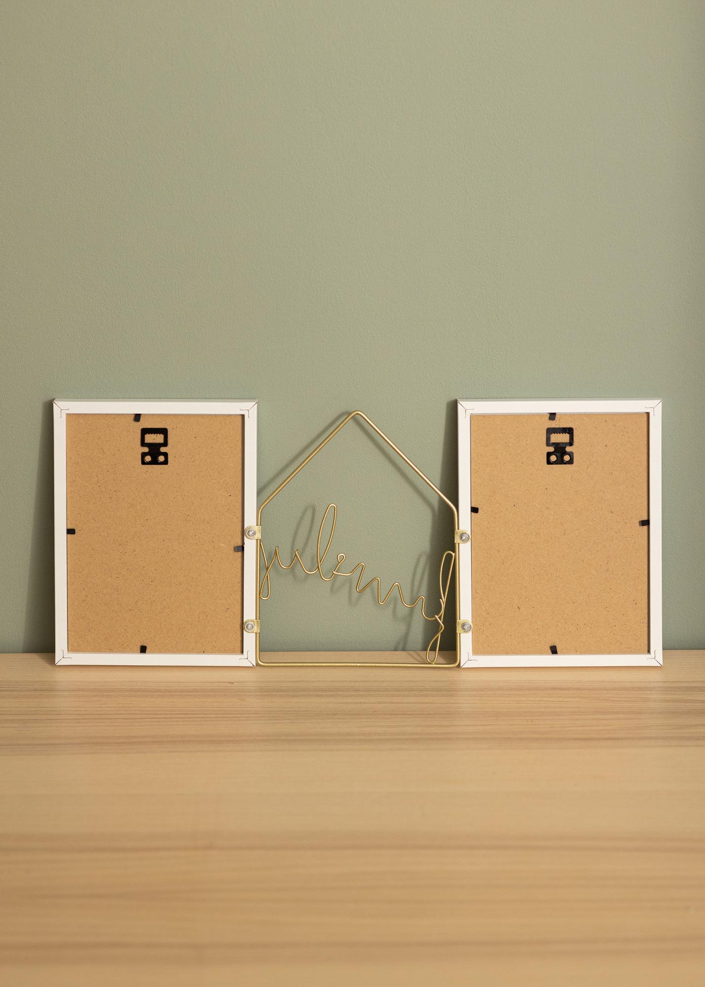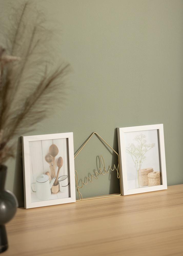 Si quieres un marco decorativo para dos fotos de tamaño 13x18 cm, este es el marco para ti. Este bonito marco collage tiene un diseño único, donde dos marcos blancos se colocan entre el texto "family" escrito en alambre de metal dorado. El alambre de metal también forma el contorno de una casa, lo que refuerza la expresión familiar del marco.