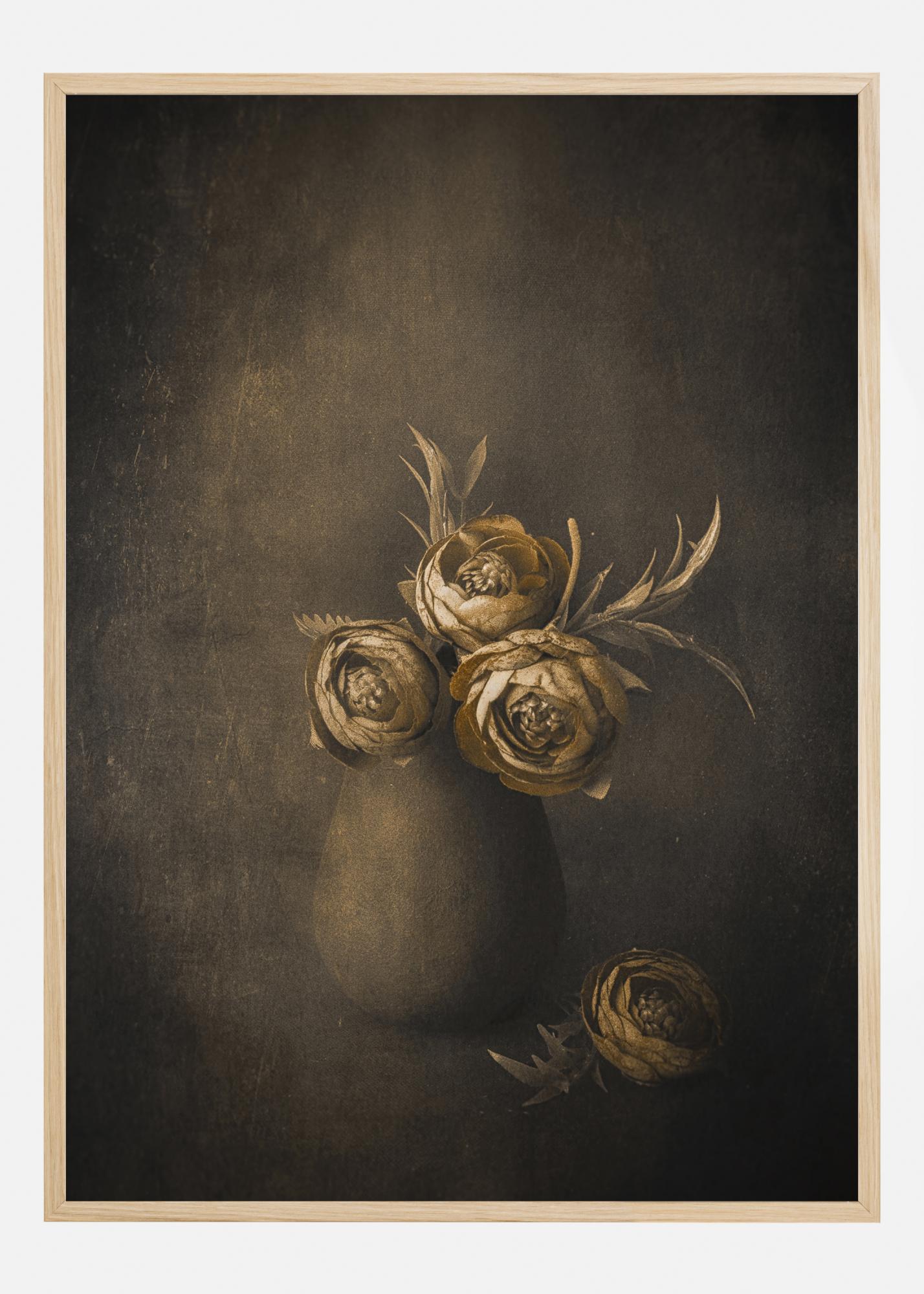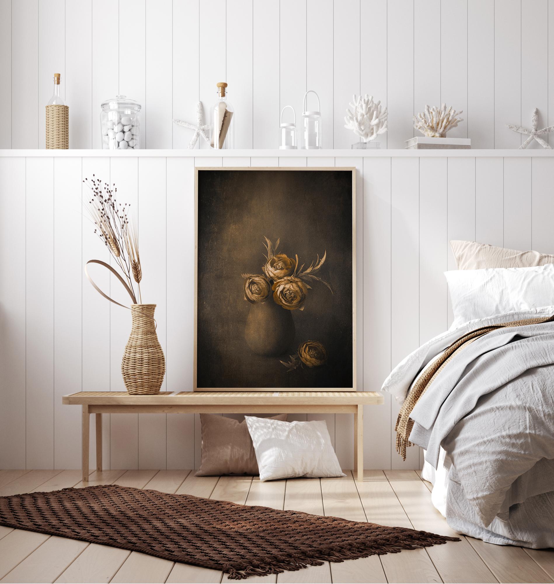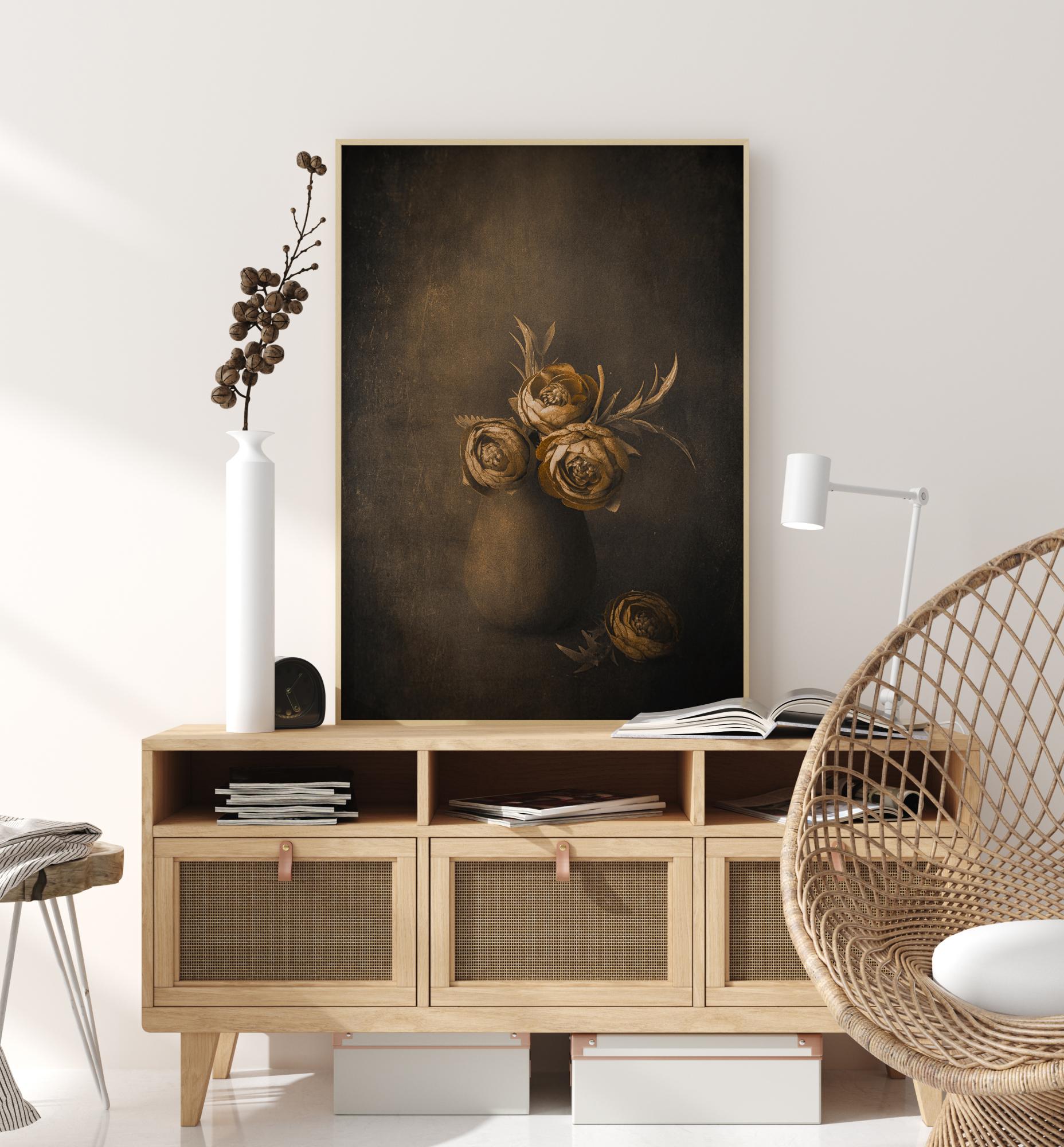 Un póster de bodegón (naturaleza muerta) con flores doradas en una jarra de barro sobre un fondo oscuro. Las flores doradas brillantes resaltan contra la pared marrón más oscura en la pintura. Combina esto con una pared de color crema para elevar las flores al siguiente nivel.