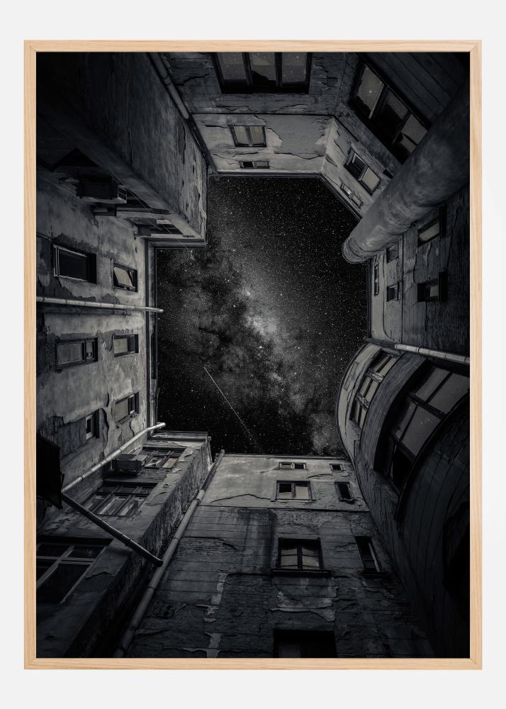 El cartel combina la belleza arquitectónica de la ciudad con la belleza natural de lo cósmico, creando un sugerente contraste entre lo urbano y lo universal. El esquema de color monocromático con sus matices de negro, blanco y gris hace que la imagen sea fácil de integrar en diferentes estilos de decoración y sería un interesante tema de conversación en cualquier habitación.