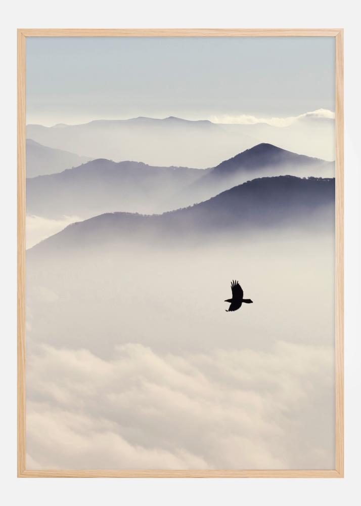 Este póster inspirado en la naturaleza captura una imagen simple pero poderosa de libertad y silencio. Un pájaro solitario navega majestuosamente sobre un valle brumoso, con capas de montañas que gradualmente desaparecen en la suave luz del amanecer o del atardecer. Los tonos suaves y el paisaje minimalista transmiten una sensación de paz y libertad ilimitada.