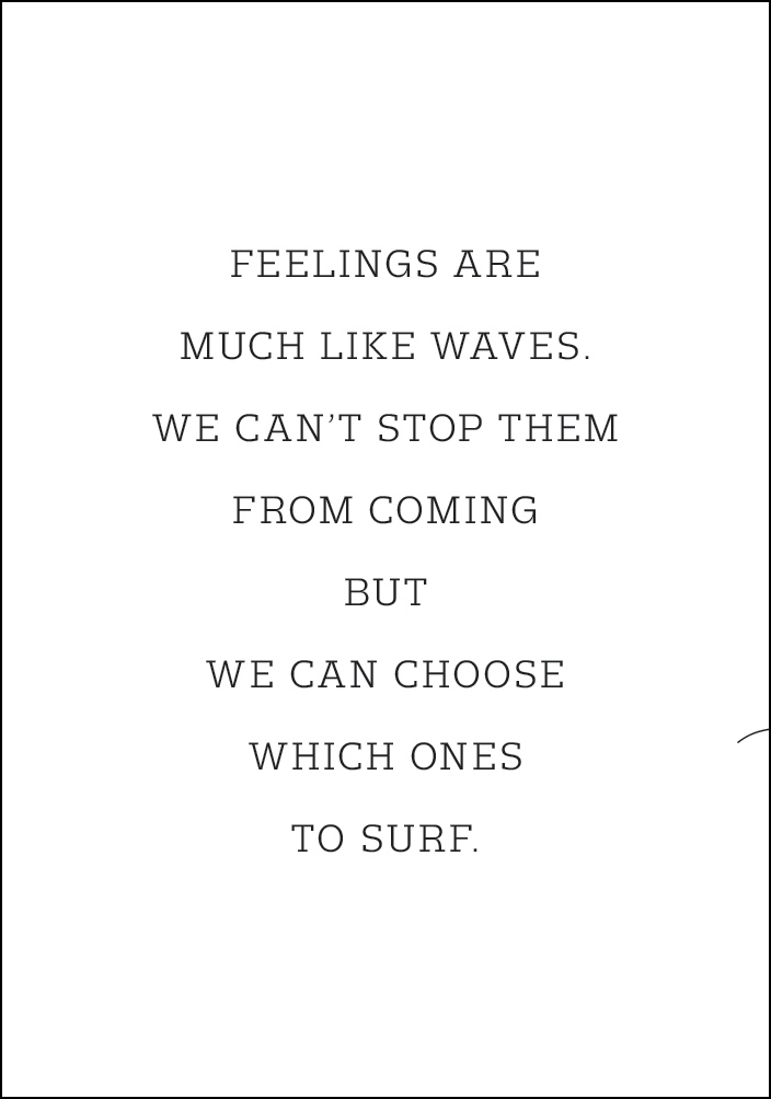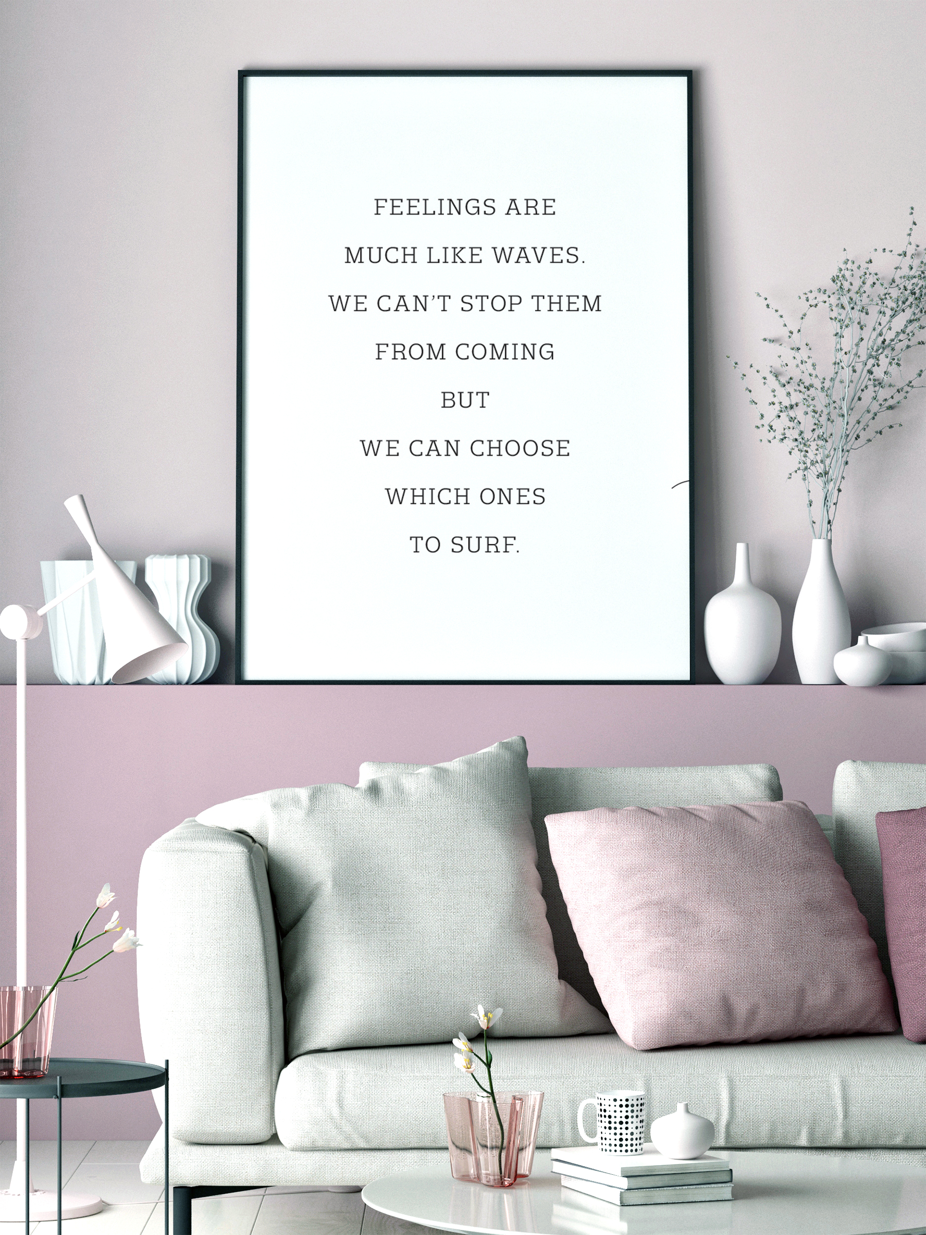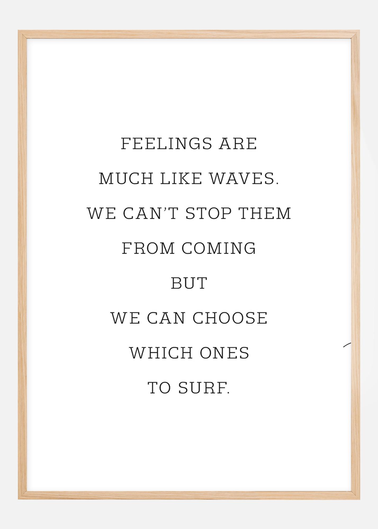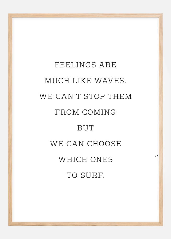 Un póster motivacional para mantenerte en marcha todos los días. Los sentimientos son como las olas. No podemos evitar que lleguen, pero podemos elegir cuáles surfear. Comienza tu día con esta poderosa cita en una tipografía sencilla sobre un fondo blanco liso.