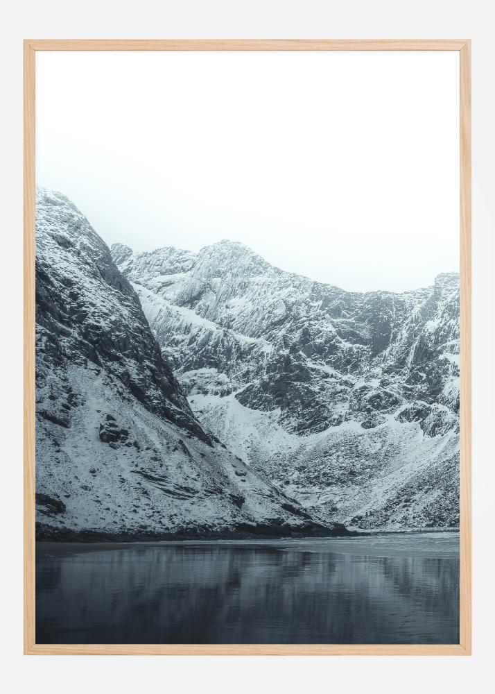 Un póster llamativo con montañas cubiertas de nieve que descienden hacia un agua tranquila. Un lago o tal vez un fiordo se extiende hacia las montañas nevadas y las encuentra en primer plano. Un cielo blanco brillante ayuda a crear una sensación de invierno. Trae el clima frío al interior cuando cuelgues esta imagen.