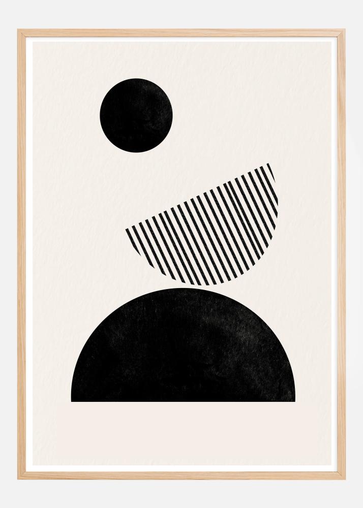 Este póster artístico se caracteriza por su uso juguetón de formas geométricas y texturas para crear una composición equilibrada y moderna. Un gran círculo negro se encuentra en la parte superior, seguido de un semicirculo acanalado diagonalmente y una forma de semicirculo sólido negro en la base. Cada elemento contribuye a una sensación de movimiento y dinamismo, mientras que la paleta de colores uniforme crea una sensación de cohesión y simplicidad.