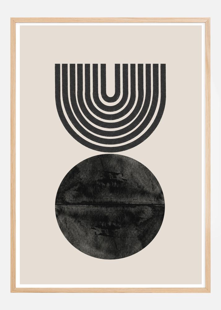 Este póster artístico capta la atención con su audaz contraste y fascinante composición de formas geométricas y orgánicas. En la parte superior aparece una serie de líneas negras que crean una forma de semicírculo, proporcionando una fuerte estructura visual contra el fondo tranquilo y neutral. Debajo vemos un círculo negro texturizado que recuerda a reflejos en el agua, lo que añade una calidad profunda y misteriosa al diseño. Los colores seleccionados en negro y blanco roto crean una paleta atemporal que atrae a una variedad de gustos y estilos de decoración.