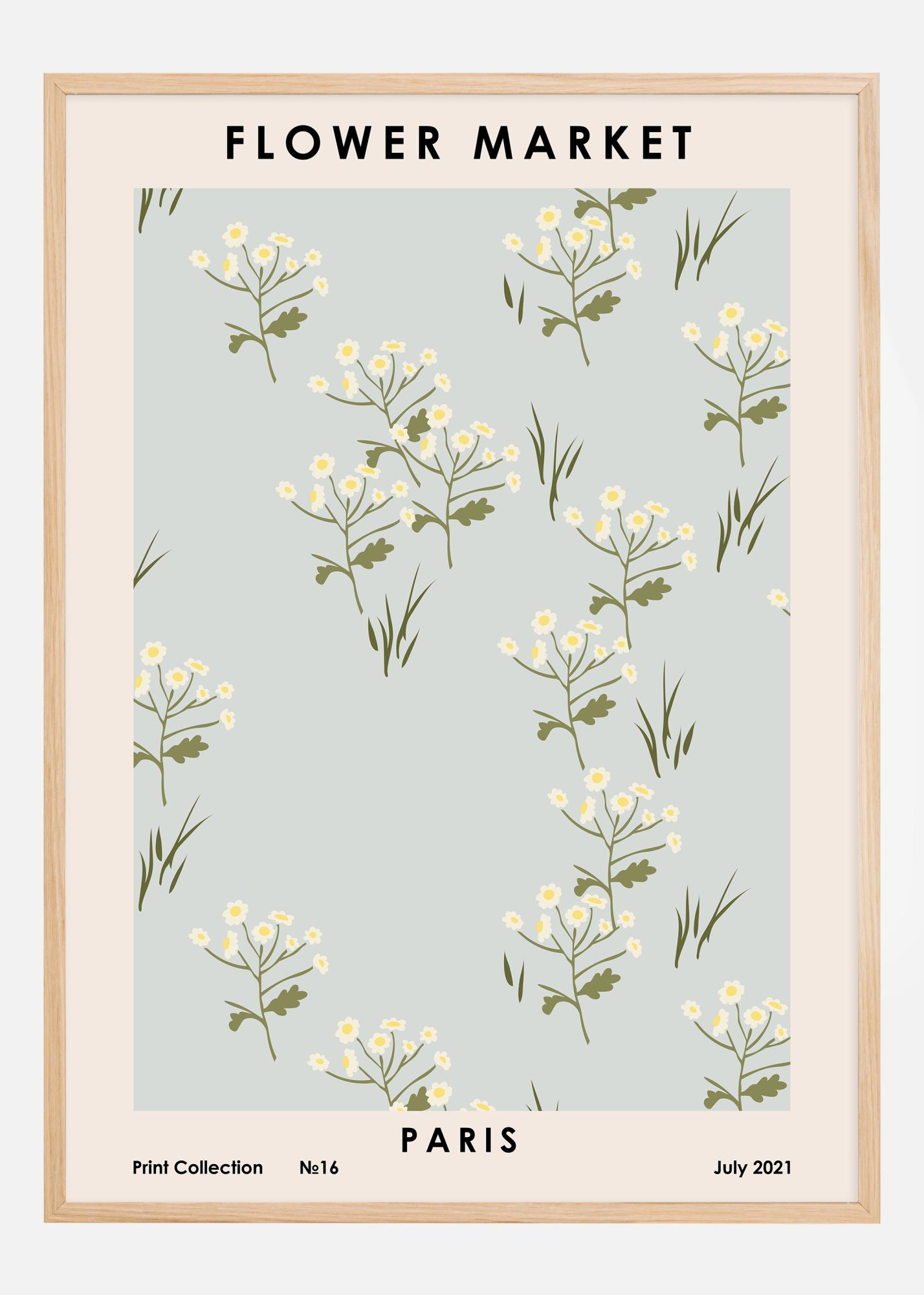 Este cartel encantador y elegante te lleva directamente al corazón de París con su imagen de un mercado de flores. Presenta un patrón de delicadas flores blancas contra un fondo gris azulado calmante, lo que brinda una sensación de frescura y elegancia sencilla. En la parte superior, se encuentra el texto "FLOWER MARKET" en una tipografía clásica, mientras que en la parte inferior contiene el texto "Print Collection ?16 PARIS Julio 2021", lo que añade una sensación de autenticidad y contexto cultural.