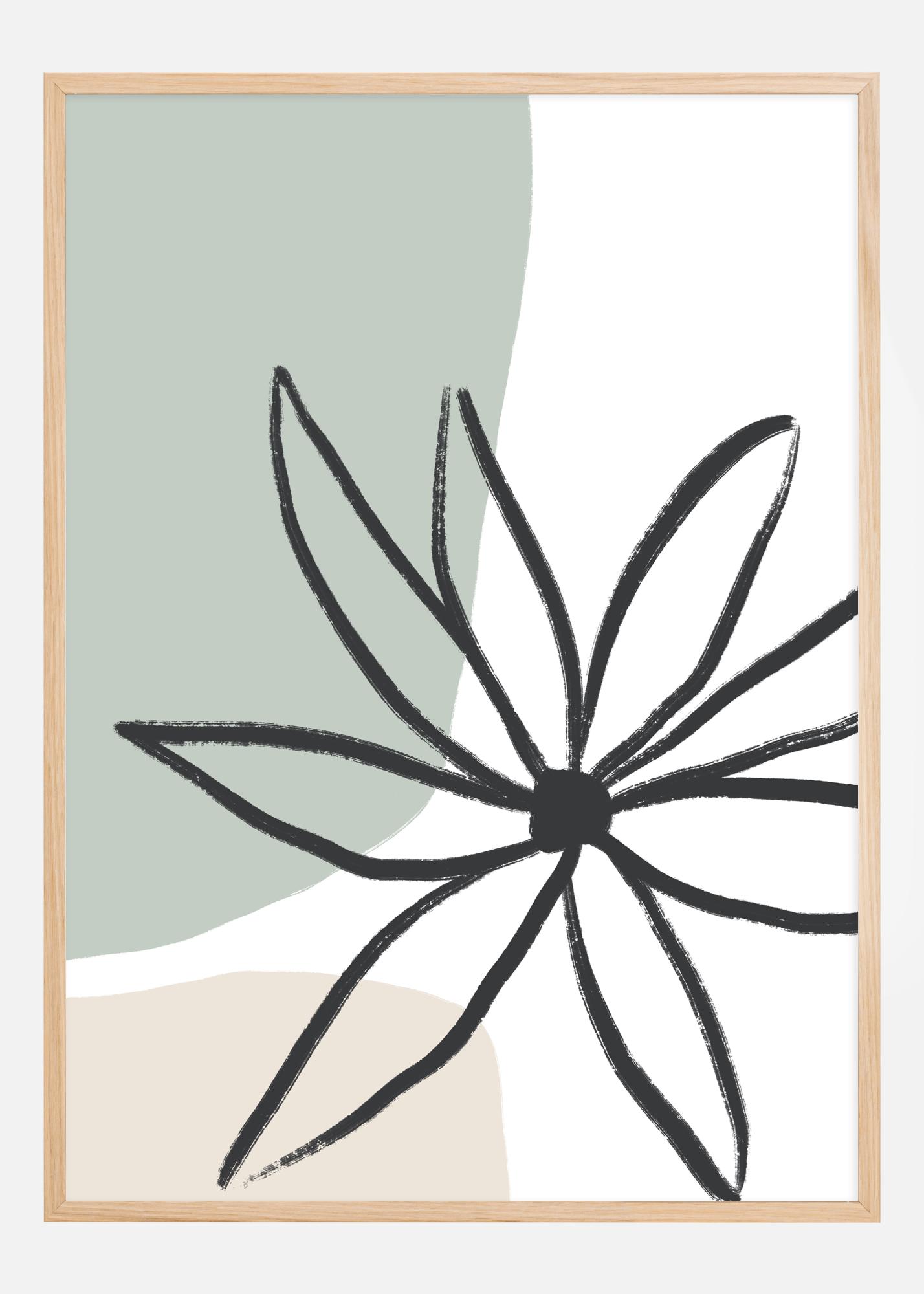Este póster, "Flor Menta y Crema", irradia una simplicidad que es tanto contemporánea como elegantemente atemporal. Su motivo presenta una flor estilizada en poderosas pinceladas negras contra un fondo calmante de color menta, creando un contraste que es tanto audaz como equilibrado. El tono cremoso y neutral que llena la mitad inferior de la imagen ofrece un contraste suave que complementa el diseño minimalista.