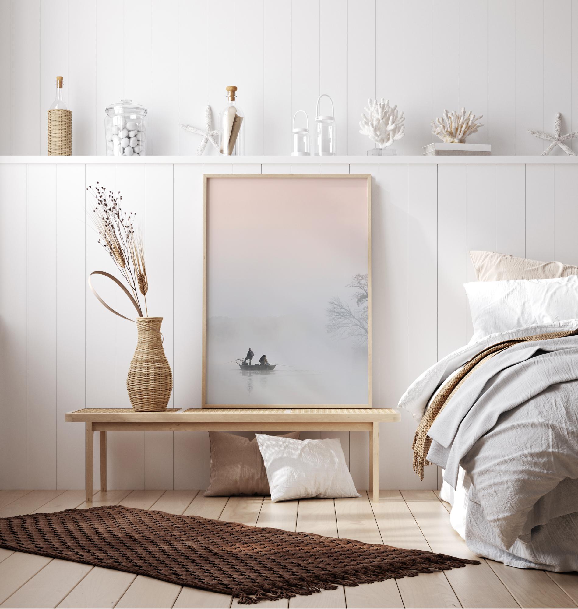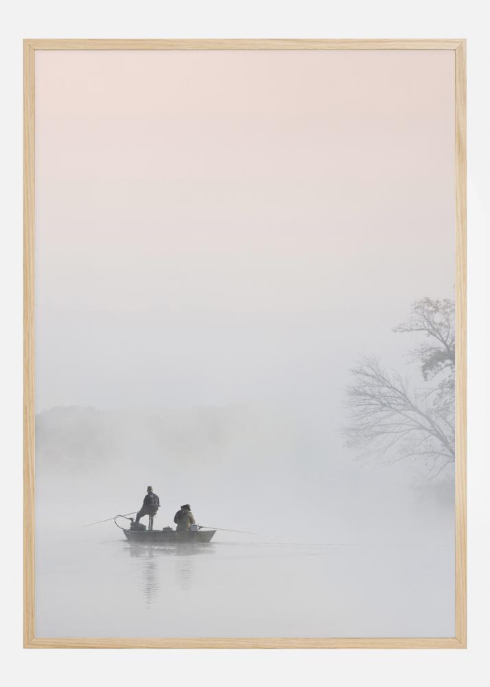 Un póster mágico con dos hombres pescando en un bote en una mañana brumosa. El pequeño bote está a la izquierda en silueta. Se pueden ver ramas de árboles a la derecha, pero todo está envuelto en una capa de niebla blanca que hace de esta una imagen mágica. Disfruta de la tranquilidad de una mañana temprana con este póster.