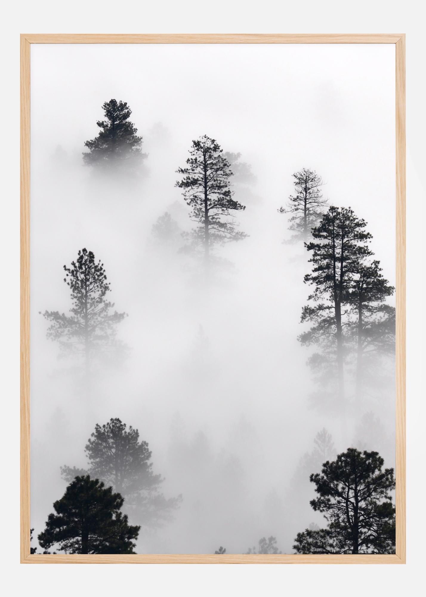 Un fantástico póster de paisaje con un bosque en la niebla. Las copas altas y oscuras de los árboles emergen de la tenue niebla blanca y crean un fuerte contraste entre la niebla y los árboles. Trae la sensación fresca del invierno a tu hogar cuando cuelgues esto en una pared neutral.