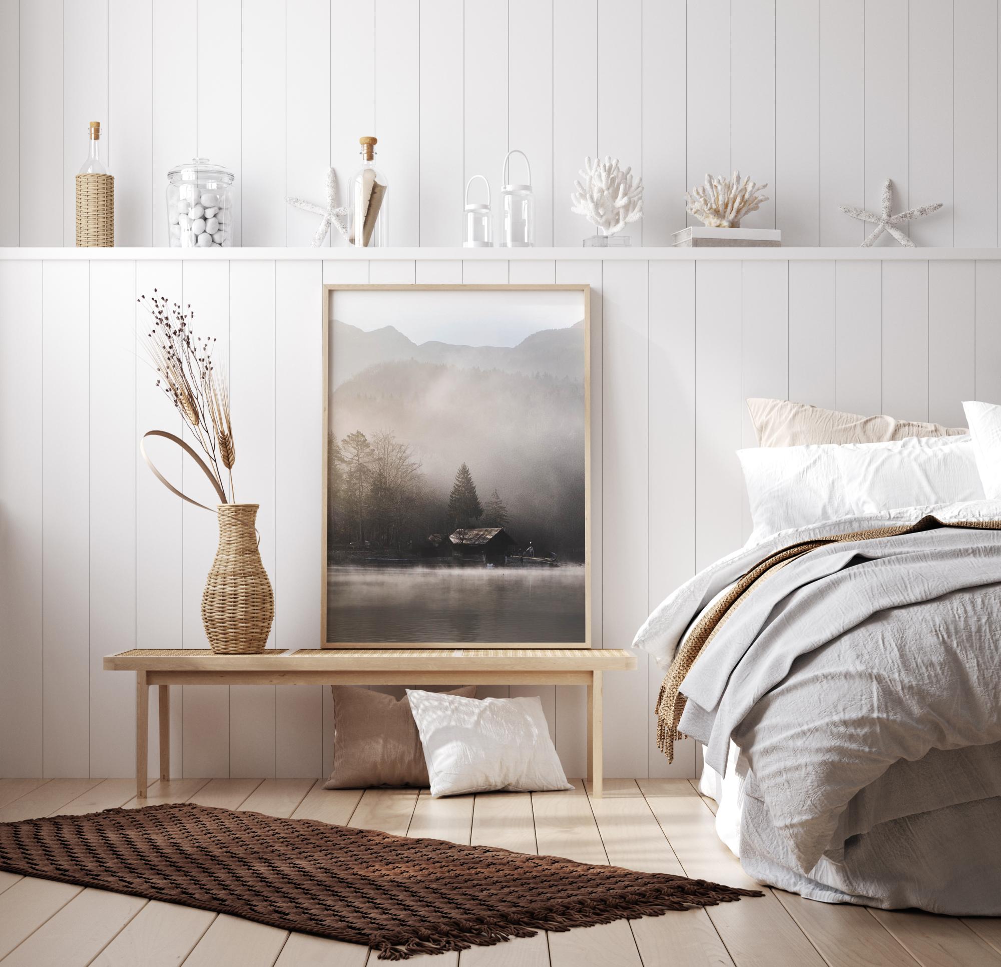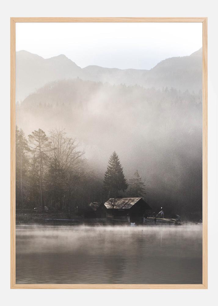 Un agradable póster con una cabaña en las montañas que se encuentra en el borde de un lago brumoso. Los tonos suaves dan a esta imagen una sensación suave donde el sol de la mañana temprano brilla desde la derecha para levantar la niebla. Cuelga esto en una pared sencilla y Piérdete en la soledad de la naturaleza salvaje y la simplicidad de este evocador póster.