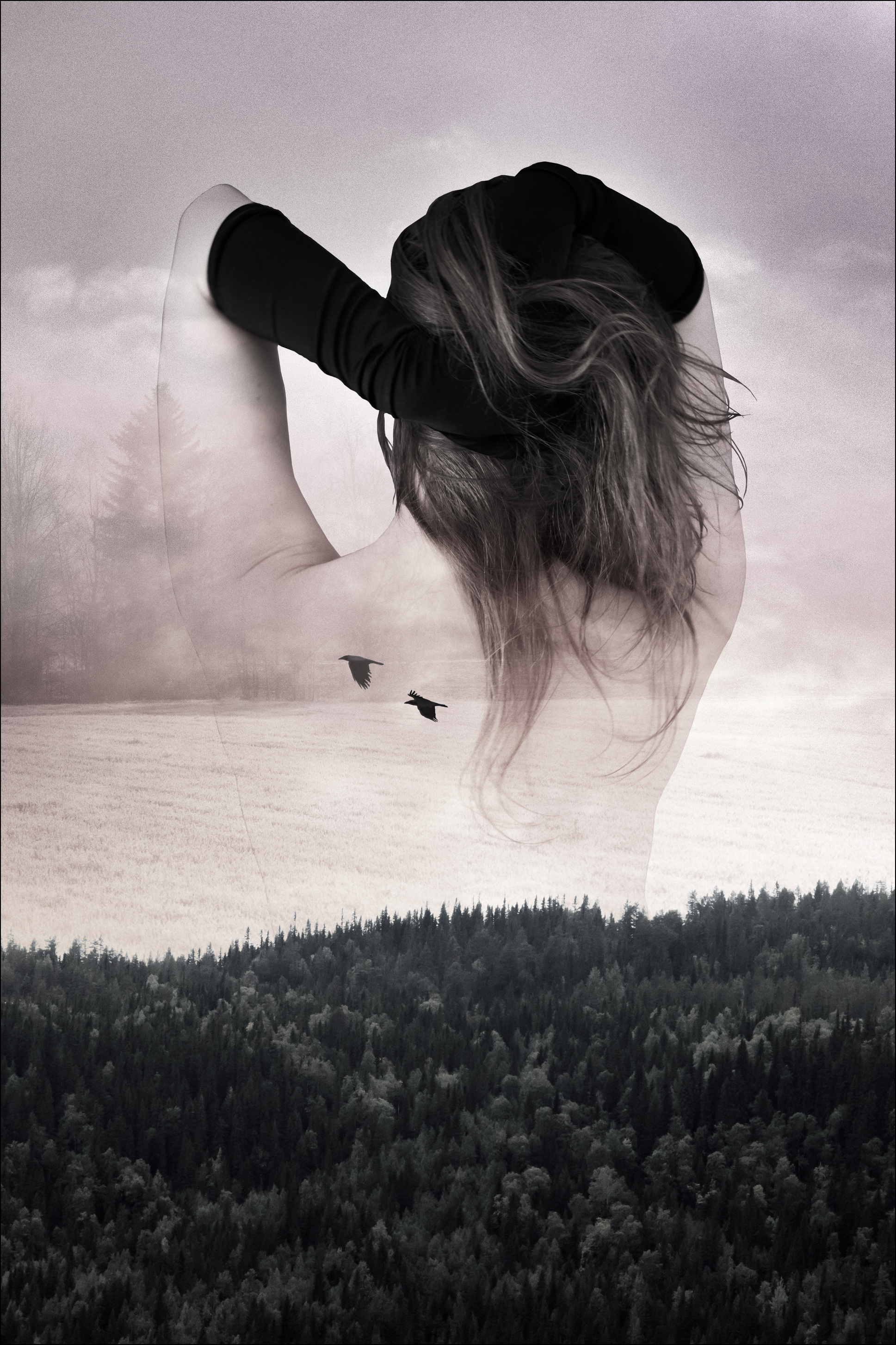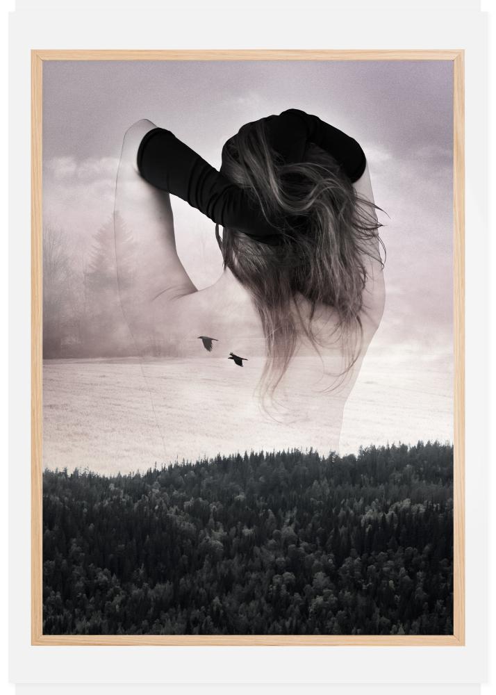 Un póster de collage con bosque y cielo debajo y una mujer en capas sobre la imagen. El alma del bosque es clara aquí, ya que el bosque oscuro llega hasta el cielo donde una mujer con un guante negro pasa la mano por su cabello. Disfruta de la composición única en esta imagen verdaderamente imaginativa.