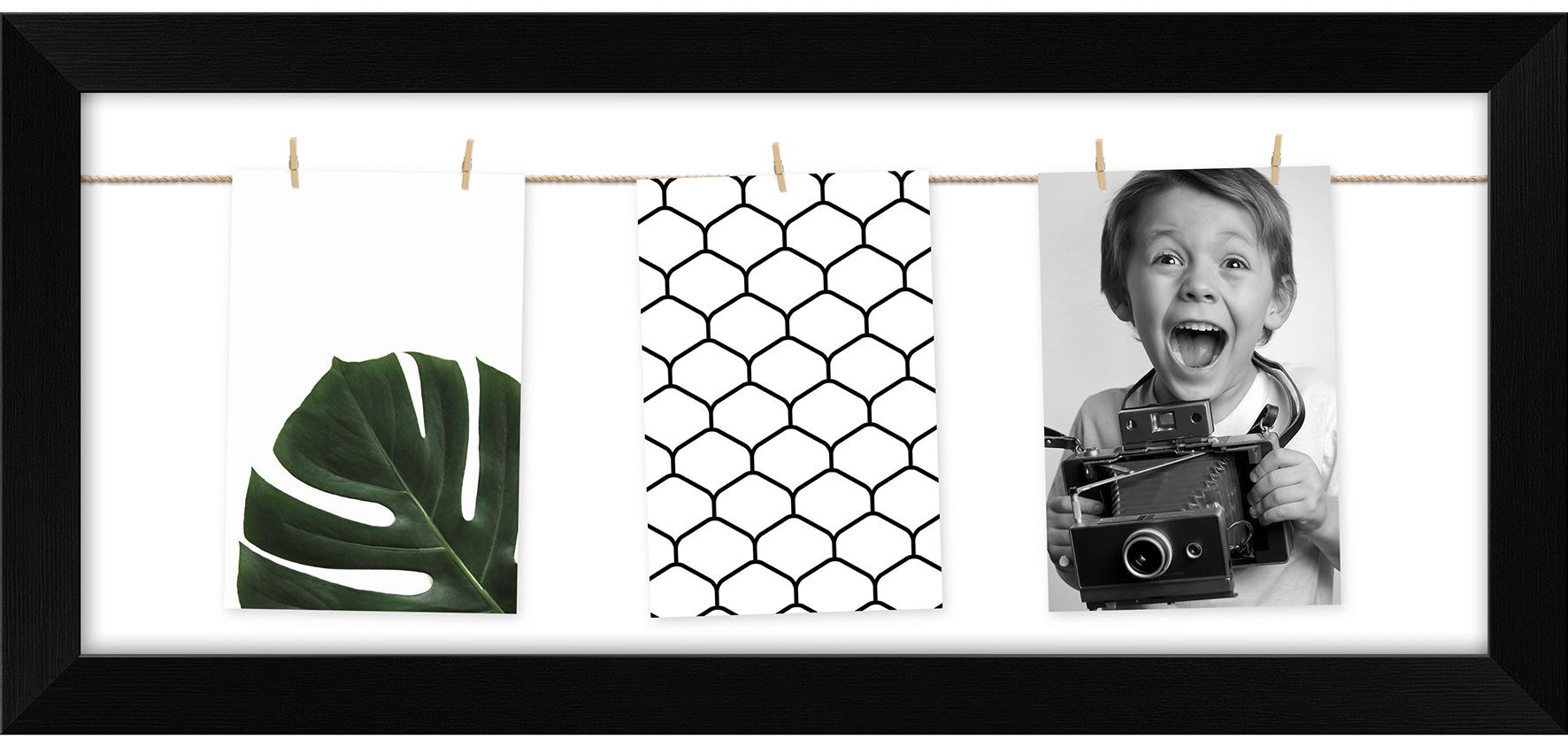 El marco tiene un diseño abierto con dos cuerdas horizontales donde puedes fijar fácilmente tus fotos con las mini pinzas incluidas. En total se incluyen 5 pinzas, lo que facilita cambiar y variar tus fotos o ilustraciones según sea necesario.