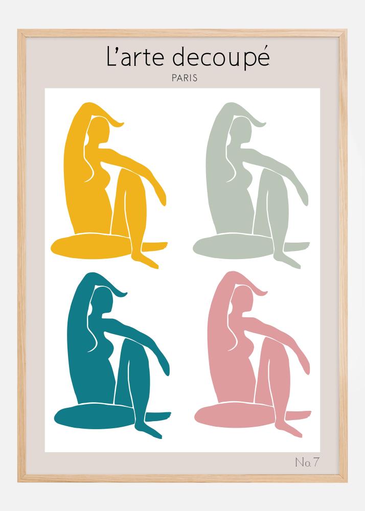Este colorido y contemporáneo póster de la serie 'L'arte découpé' presenta cuatro figuras estilizadas en una composición dinámica y armoniosa. Cada figura está cuidadosamente elaborada en un color distintivo - amarillo sol, azul cielo, verde suave y rosa cálido - y están colocadas contra un fondo gris que ofrece una expresión tranquila y equilibrada. Esta impresión artística celebra la diversidad y el movimiento de la forma humana a través de su diseño abstracto y simplificado, creando una expresión visual fuerte que encaja bien en un estilo de decoración moderno.