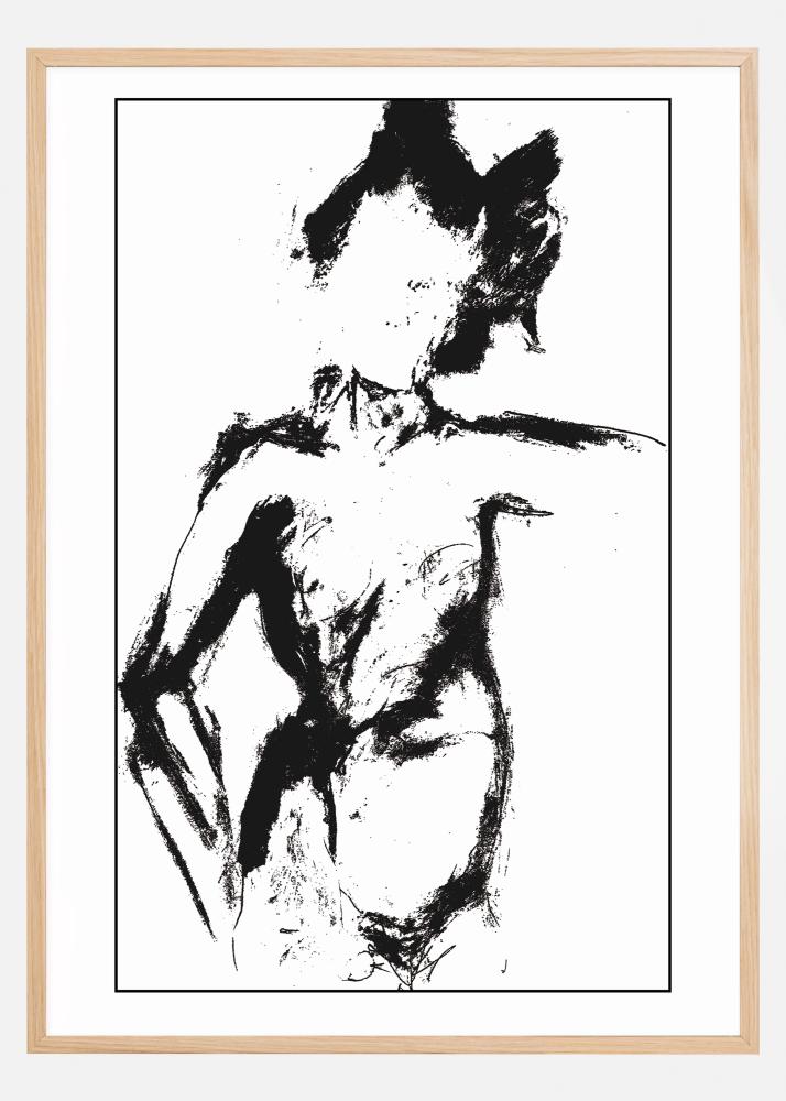 Un póster en blanco y negro con un dibujo de una figura. Los gruesos y audaces trazos negros del pincel han creado a esta mujer en un estilo casi chiaroscuro. Mírala por un momento y casi esperarás que se mueva.