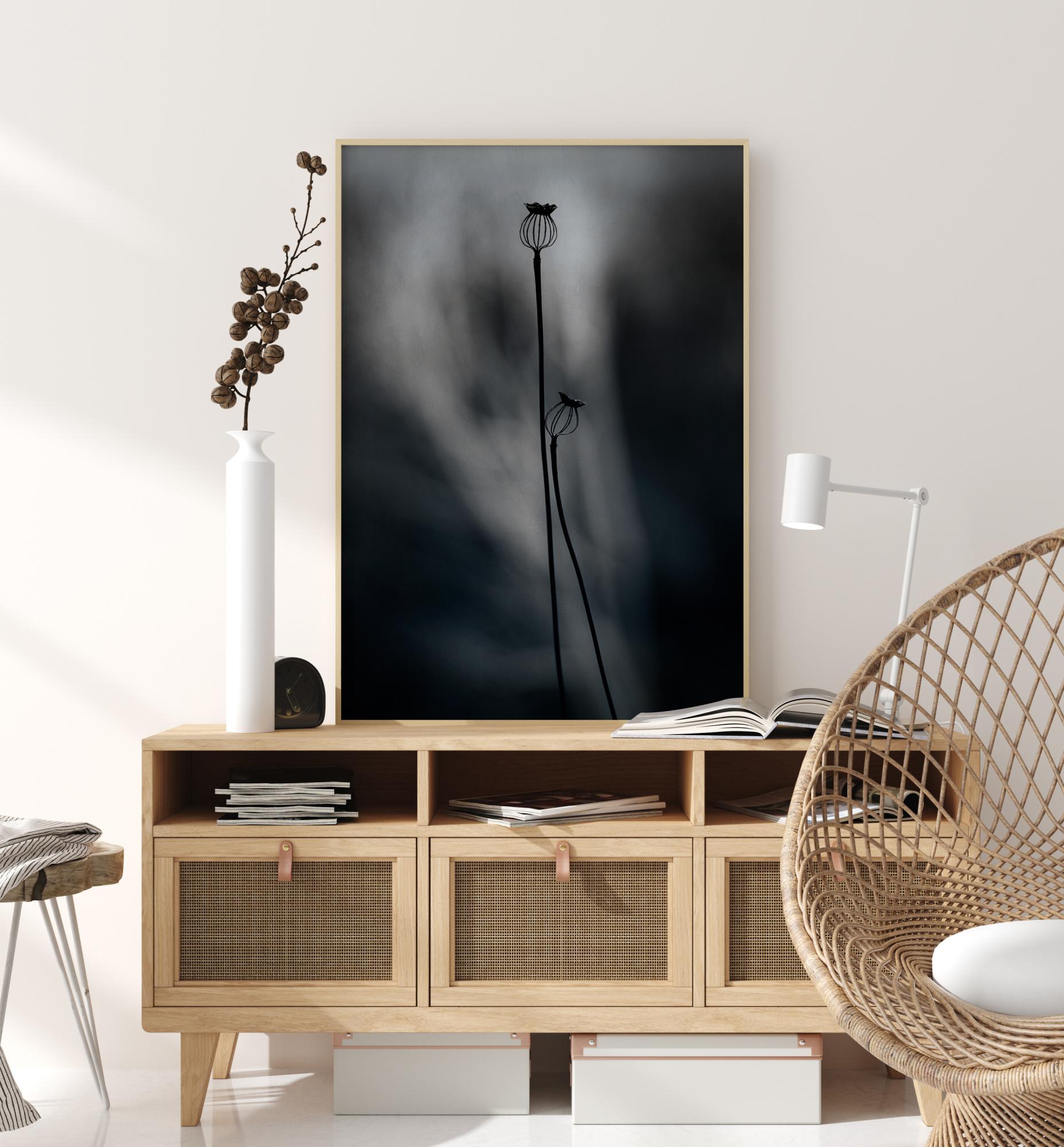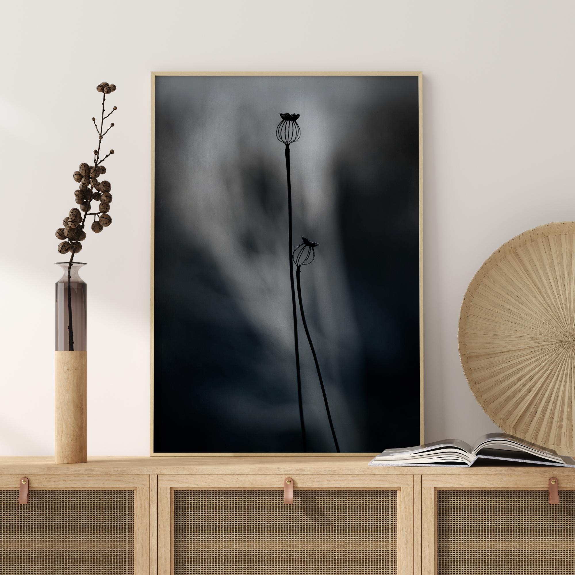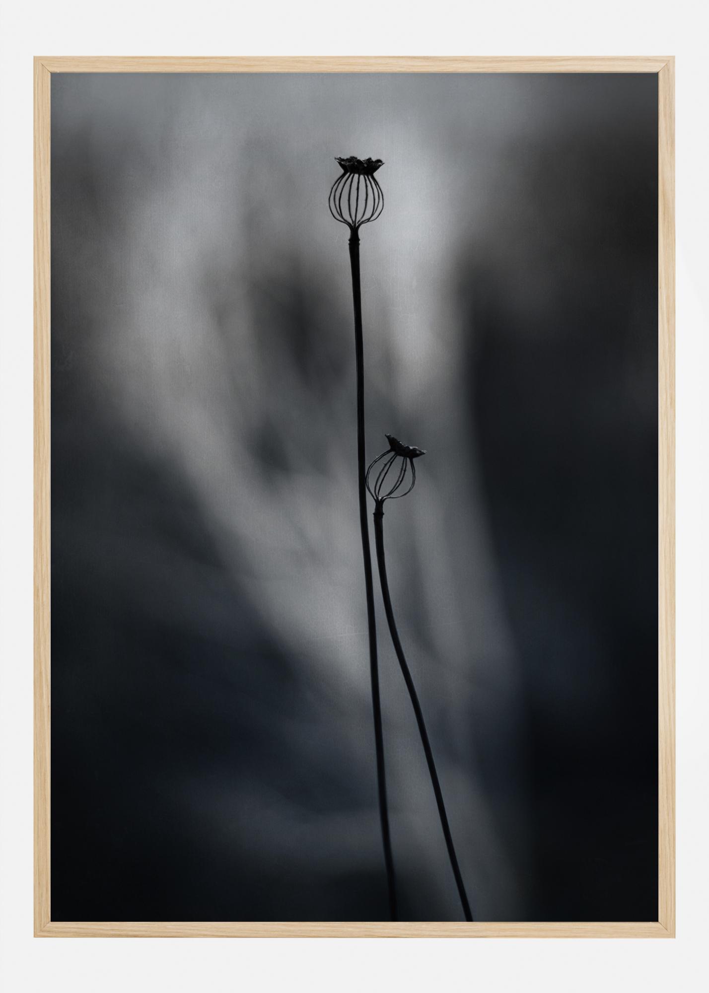 Un póster etéreo de dos cápsulas de semillas de amapola contra un fondo ligeramente borroso. Esta imagen abstracta te cautivará durante muchas horas. Añade esta fantástico mezcla de tranquilidad y movimiento a tu hogar.