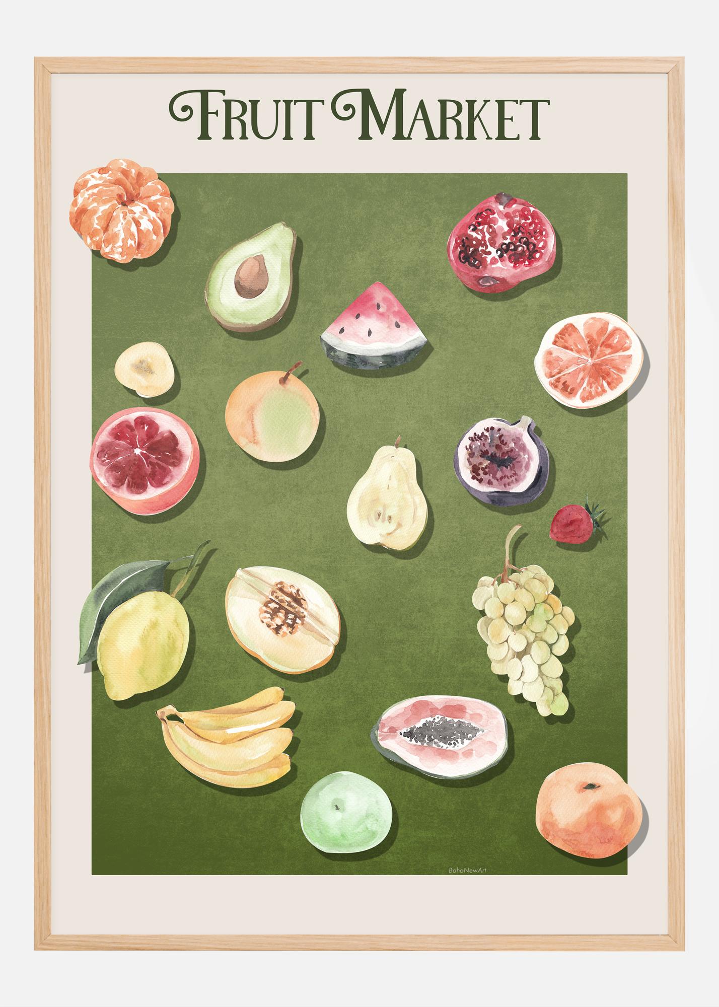 Este colorido cartel captura la esencia de un animado mercado de frutas y es una adición fantástica a nuestra colección de arte de interiores. La impresión es un deleite visual con una serie de jugosas frutas presentadas sobre un rico fondo verde, creando una sensación de frescura y abundancia. Desde los cítricos maduros por el sol hasta los trazos tropicales de aguacate y granada, esta obra ofrece un festín visual que inspira y embellece. Cada fruta está representada con un nivel de detalle que resalta sus texturas y formas únicas, lo que convierte a este póster en un imprescindible para quienes aprecian el arte realista.