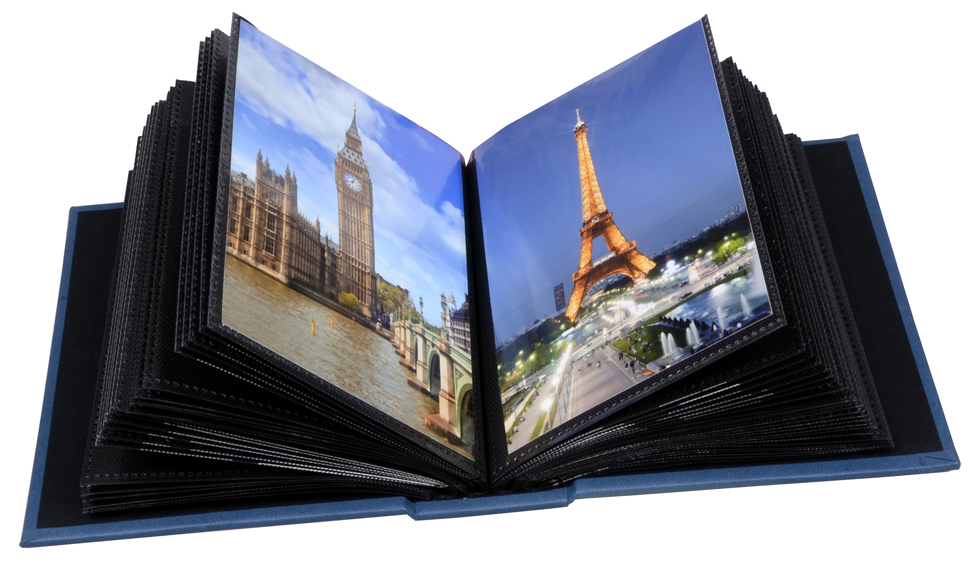 El álbum tiene cubiertas exteriores robustas en un tono azul mate. Las páginas del álbum son negras y tienen espacio para 1 foto por página, y Además, son libres de ácido.