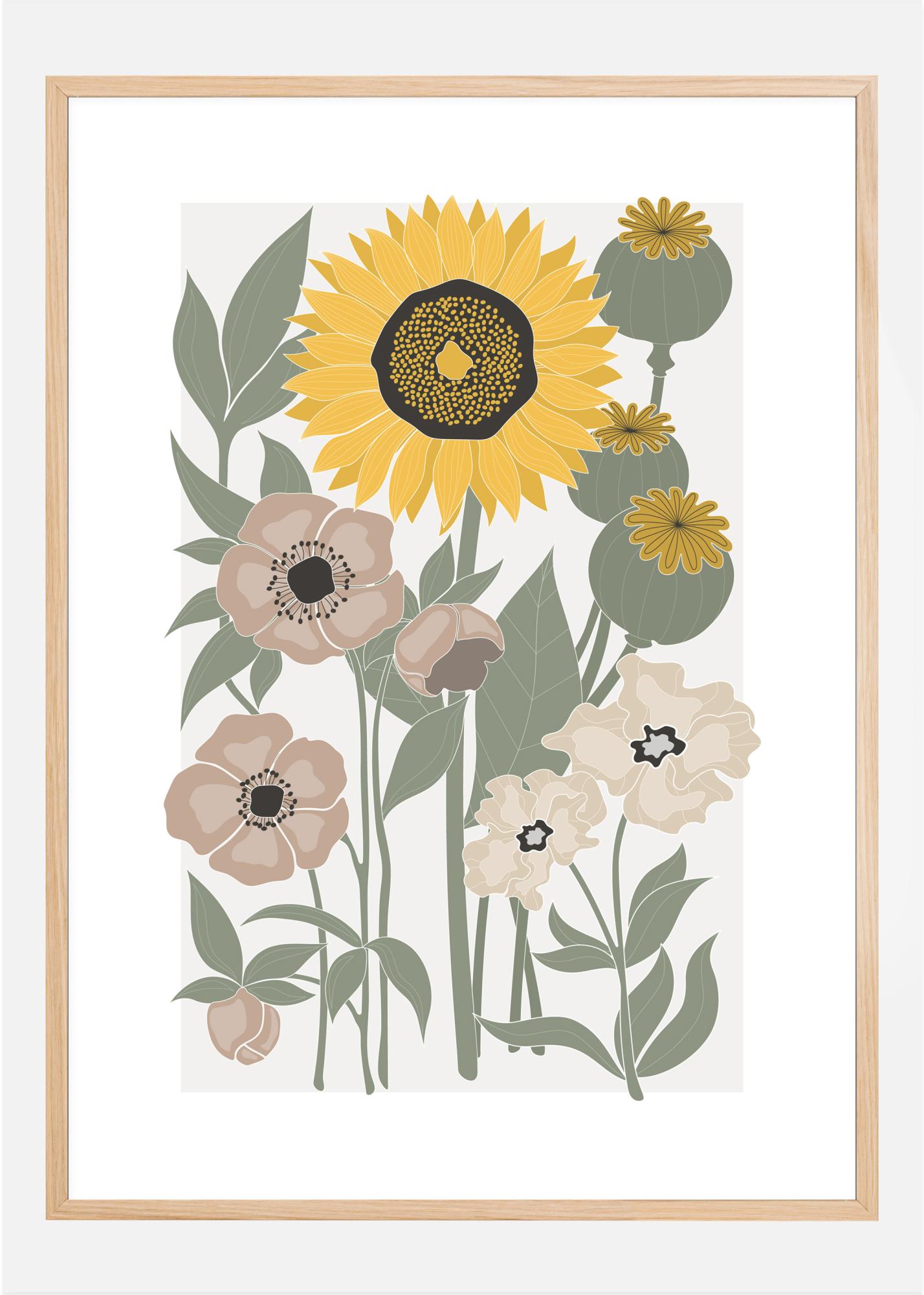 Un póster suave con diferentes flores. Un brillante girasol domina el centro de la imagen junto con otras flores como amapolas en este póster de jardín. El estilo sencillo hace que sea fácil ver los detalles y disfrutar de esta imagen soleada.