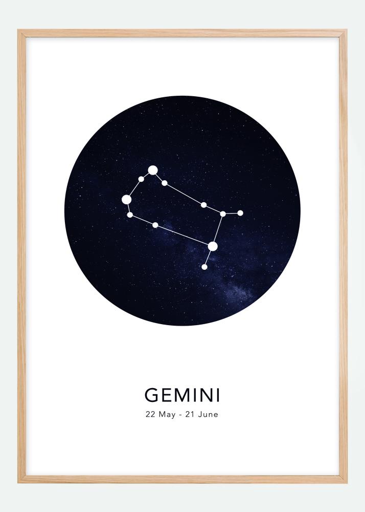 ¡Regala un cuadro personalizado a alguien que te importe! Este elegante póster tiene un motivo del signo zodiacal de Géminis sobre un fondo de cielo estrellado en negro y azul. Debajo se encuentra el nombre junto con la fecha actual en inglés.