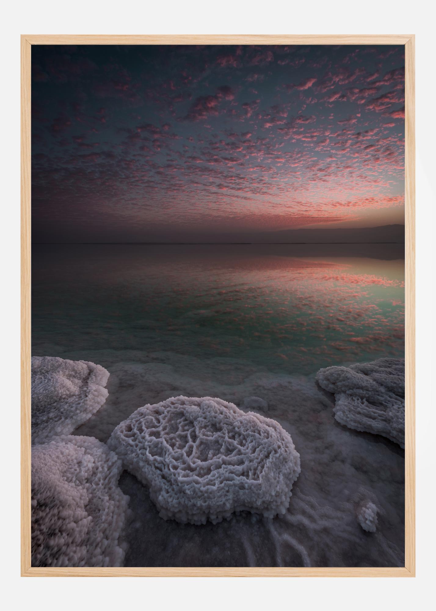 Un hermoso póster con un lago extenso. En primer plano, se han formado grandes cristales de sal que crean patrones naturales fantásticos. El lago se extiende hacia el horizonte mientras un cielo nocturno dramáticamente rojo y azul contribuye a la sensación mágica de esta imagen.