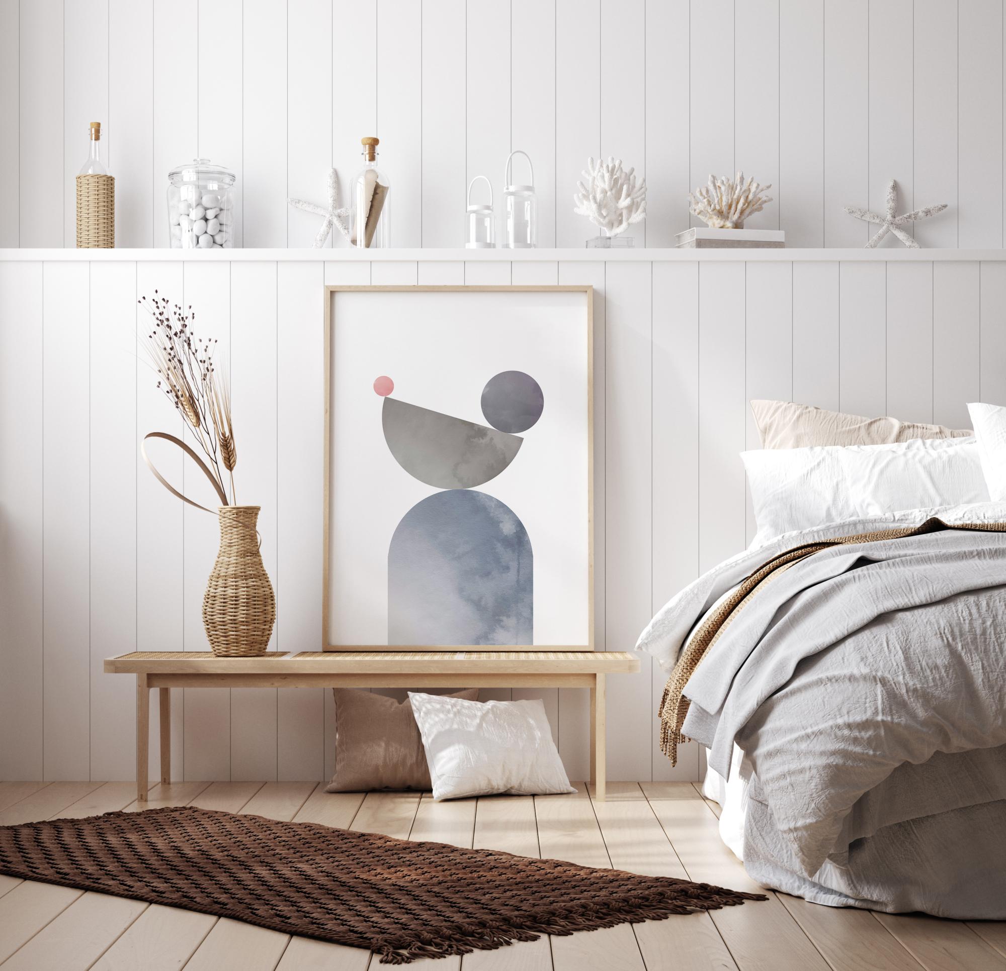 Un póster abstracto con formas geométricas y círculos. Hay una gran forma azul llena de nubes en la parte inferior. En la parte superior, hay un semicírculo gris equilibrado con un pequeño círculo rosa en un extremo y un grande azul en el otro. Puedes sentarte durante horas y fascinarte con el equilibrio de esta imagen.