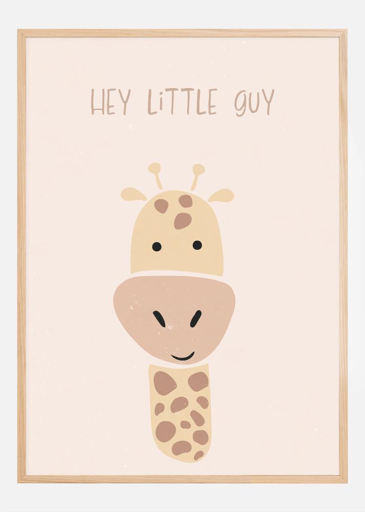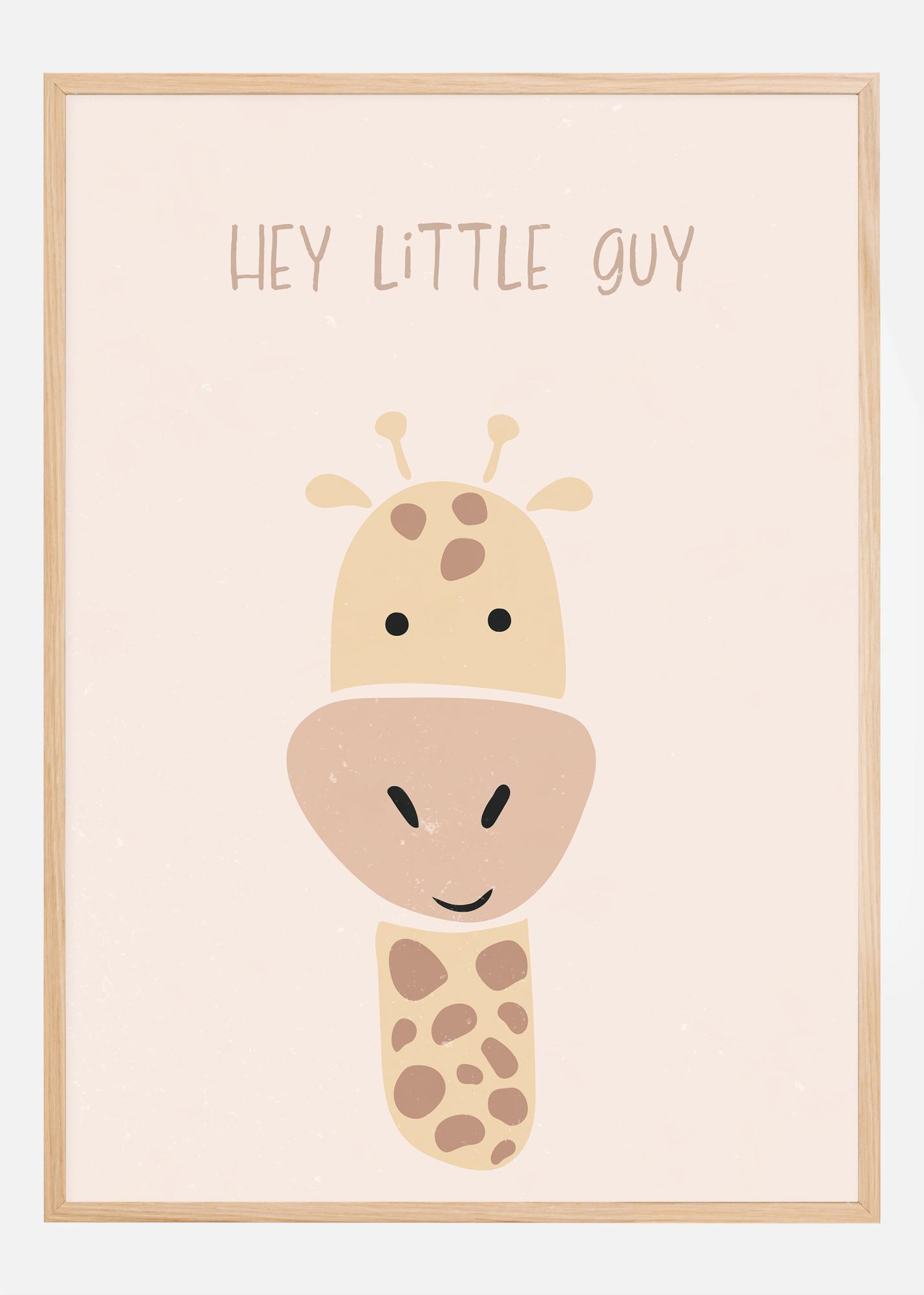 Este encantador póster con el texto "HEY LITTLE GUY" y una ilustración de una cría de jirafa es la decoración de pared perfecta para una habitación infantil o un toque lúdico en otra habitación luminosa. El motivo se caracteriza por colores suaves como el rosa pálido de fondo y tonos cálidos beige y marrón en el dibujo de la jirafa. La jirafa dibujada, con su diseño simple y amigable para los niños, lleva una gran sonrisa y ojos amigables, creando una conexión inmediata y contribuyendo a una atmósfera alegre y acogedora.
