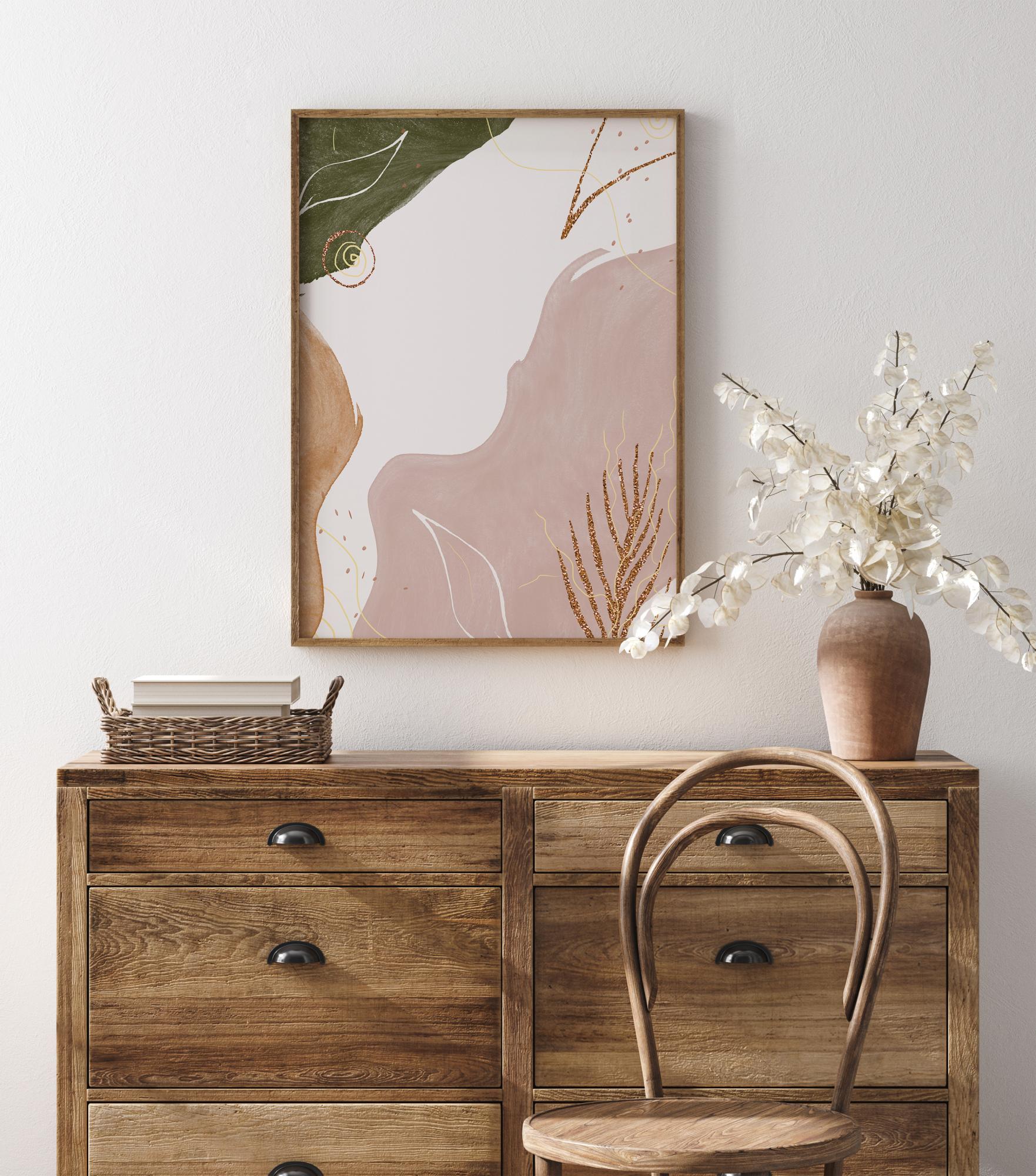 Un póster abstracto y apacible con hojas y detalles brillantes. Grandes bloques de color en forma de hojas llenan este póster con pequeñas ramas y ramitas creadas con oro brillante. Combina esto con cualquier color pastel para aportar un toque elegante a tu pared.