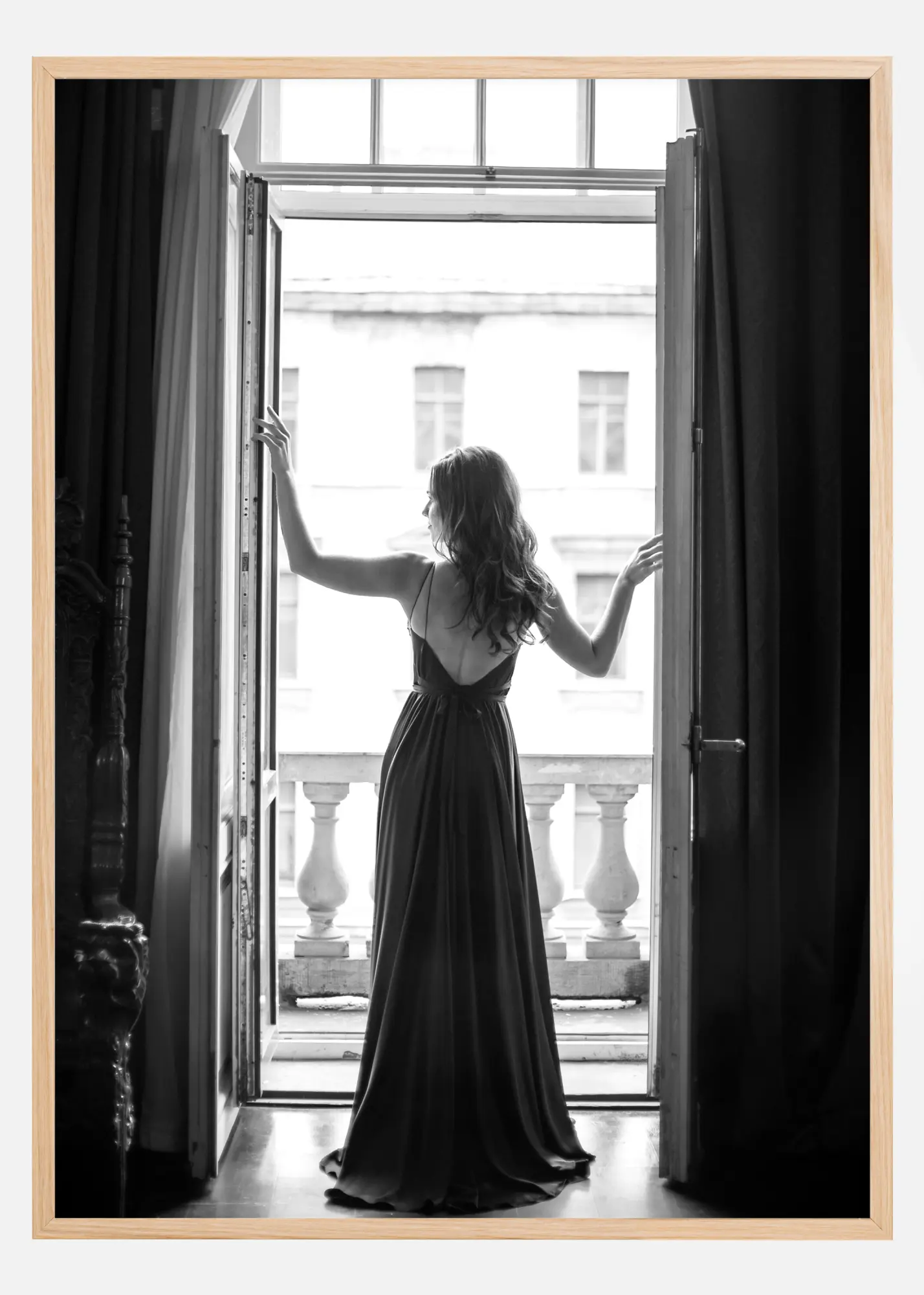Una fotografía en blanco y negro de una mujer con un vestido largo parada frente a unas puertas de balcón abiertas, mirando hacia el día. Delante de ella se vislumbran pilares de concreto desgastados y una fachada antigua y deteriorada. Un póster que respira una maravillosa mezcla de lo hermoso y lo vivo en contraste con lo viejo y desgastado por el clima.