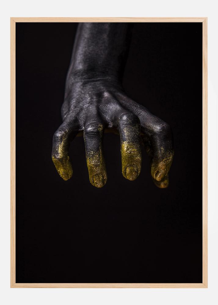 Un póster llamativo de una mano embarrada que se extiende hacia abajo. Una mano negra entra desde arriba en la foto, con los dedos doblados y listos para agarrar algo. Las puntas de los dedos están cubiertas dorado brillante para destacar. Añade esta imagen épica a tu hogar.