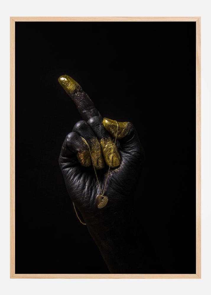 Un póster llamativo con una mano negra con dedos dorados que apunta hacia la izquierda. El puño cerrado utiliza el dedo índice para señalar algo que no podemos ver. Alrededor de la mano cuelga un medallón dorado que cae elegantemente sobre los dedos dorados. Cuelga esto en una pared blanca o crema para causar una fuerte impresión.