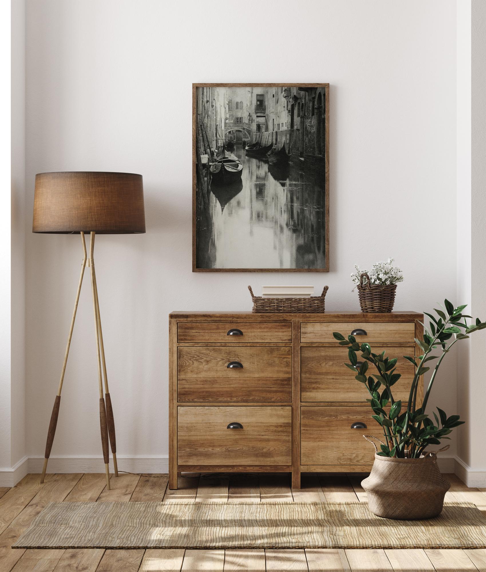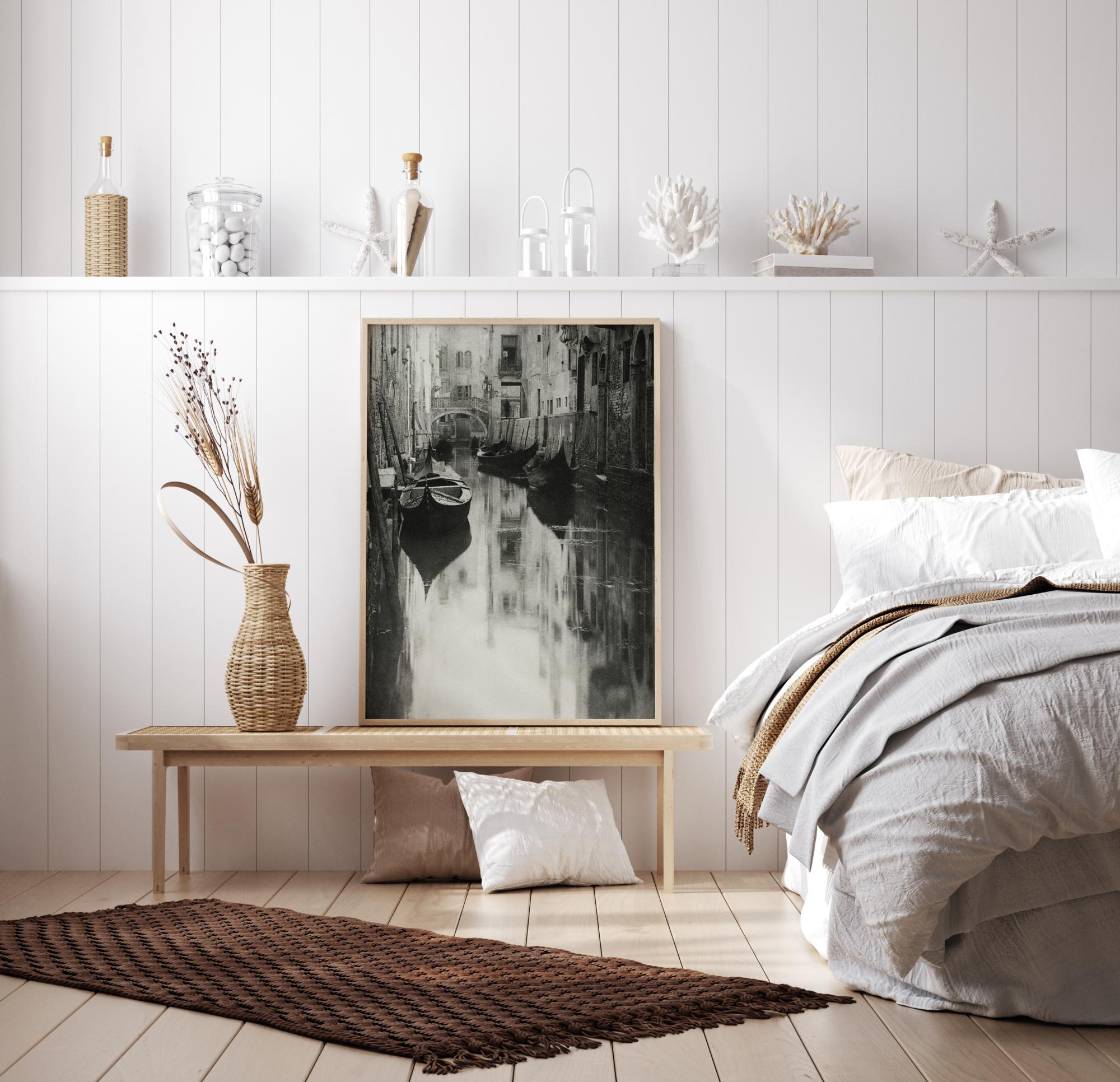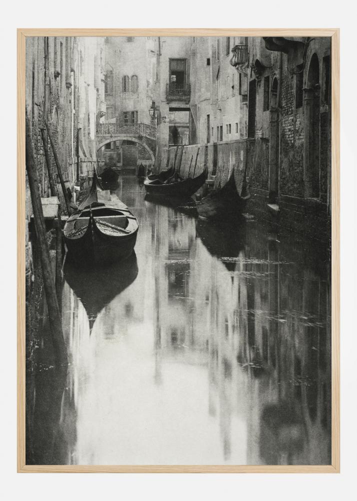 Un póster en blanco y negro con góndolas amarradas en un canal en Venecia. Los barcos están quietos en el agua tranquila junto a los empinados lados de las casas. La imagen transmite calma y tranquilidad en esta parte apartada de la ciudad.