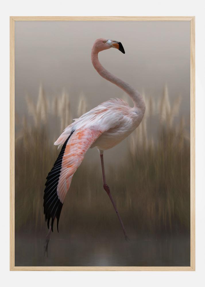 Un póster de animales con un flamenco rosa que sobresale. Los tonos de color y el desenfoque de la foto casi dan la sensación de una pintura. Puedes fantasear con caminar junto al pájaro cuando combines este póster con una pared azul sencilla.