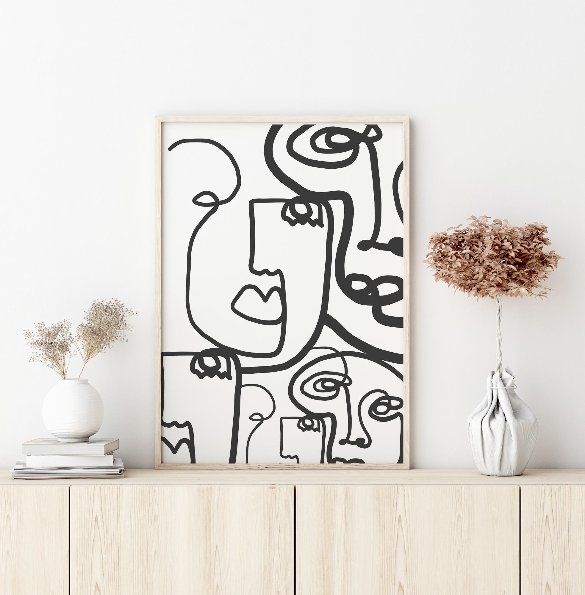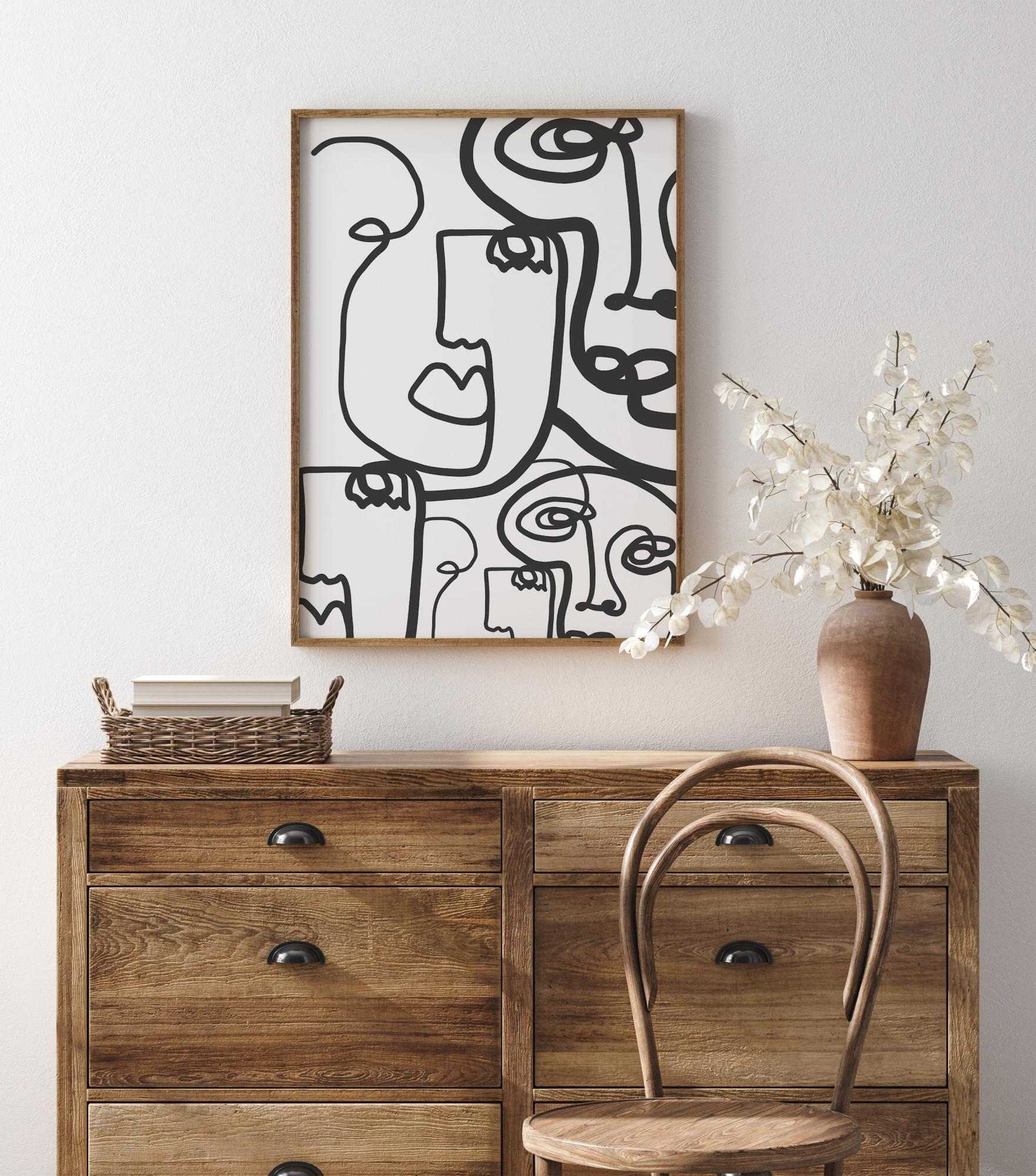 Un póster abstracto y llamativo con muchas caras dibujadas. Líneas negras gruesas y finas llenan esta imagen para crear cinco caras separadas. Las líneas giran alrededor del fondo blanco, por lo que debes concentrarte para encontrar todas las caras que se esconden en esta imagen vívido.