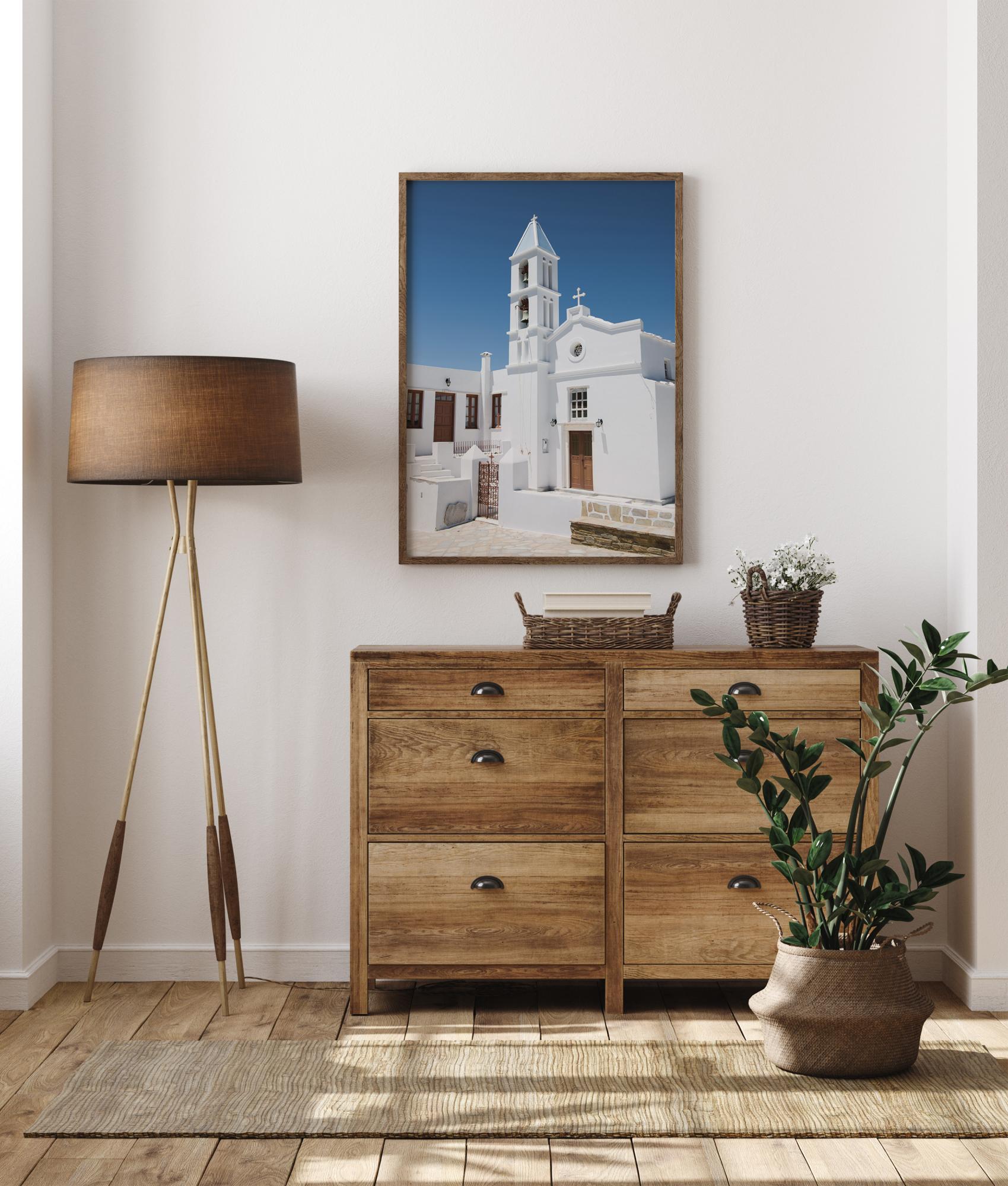 Un póster arquitectónico con una iglesia blanca en Grecia frente a un cielo azul fascinante. El contraste entre el blanco y el azul crea una sensación de lo exótico de una manera brillante y animada en esta imagen sencillo pero cautivadora. Cuando cuelgues esto, podrás disfrutar de unas vacaciones desde casa.